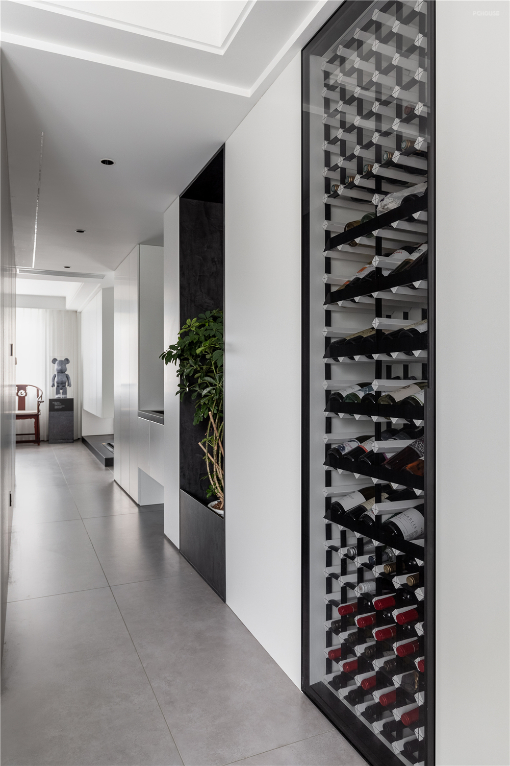 背面在餐厅则是红酒柜,正对楼梯起步,则是双面通透的植物景观开放格。