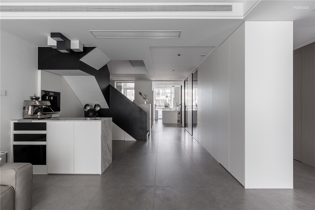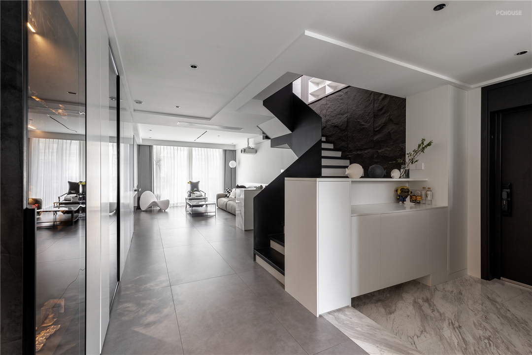 弧形楼梯改U形折梯,梯步的设计取材便宜的中国黑烧毛面,立板则是纯白岩板,视觉上有类似悬浮的效果,墙面搭配石皮,行走其间,特别是从上往下正对景观柜的高大绿植,有宛若穿越“山”林的视觉感和心理感受,也是作品主题意义所在之一。