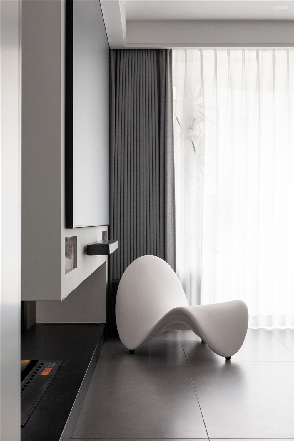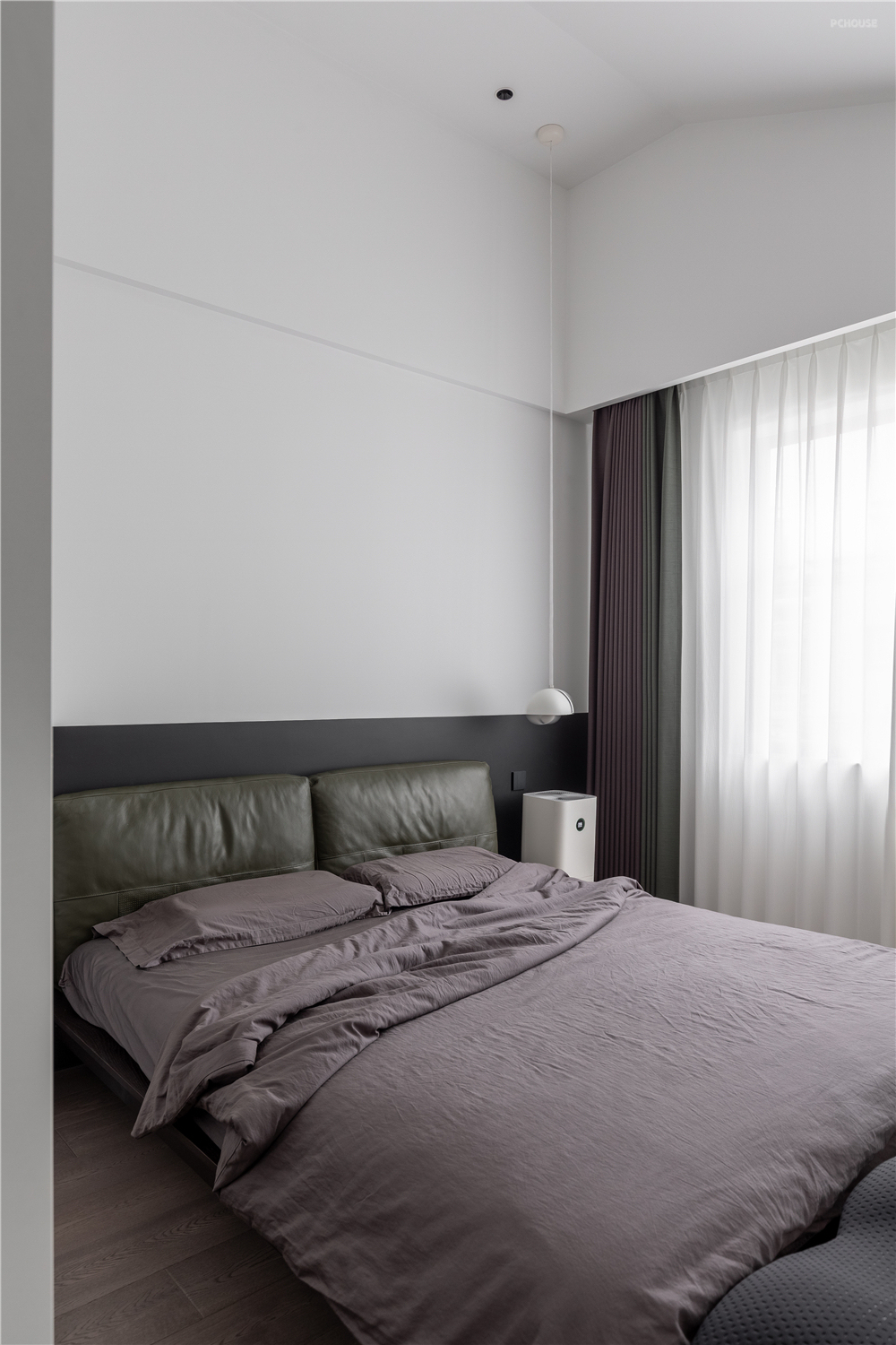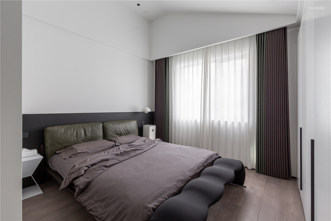 主卧没有电视,让卧室回归它最原始的诉求-睡眠。西墙利用南厅部分空间,做出整面柜体,柜体和墙面衔接也做了门板的材质,整体感更完整。