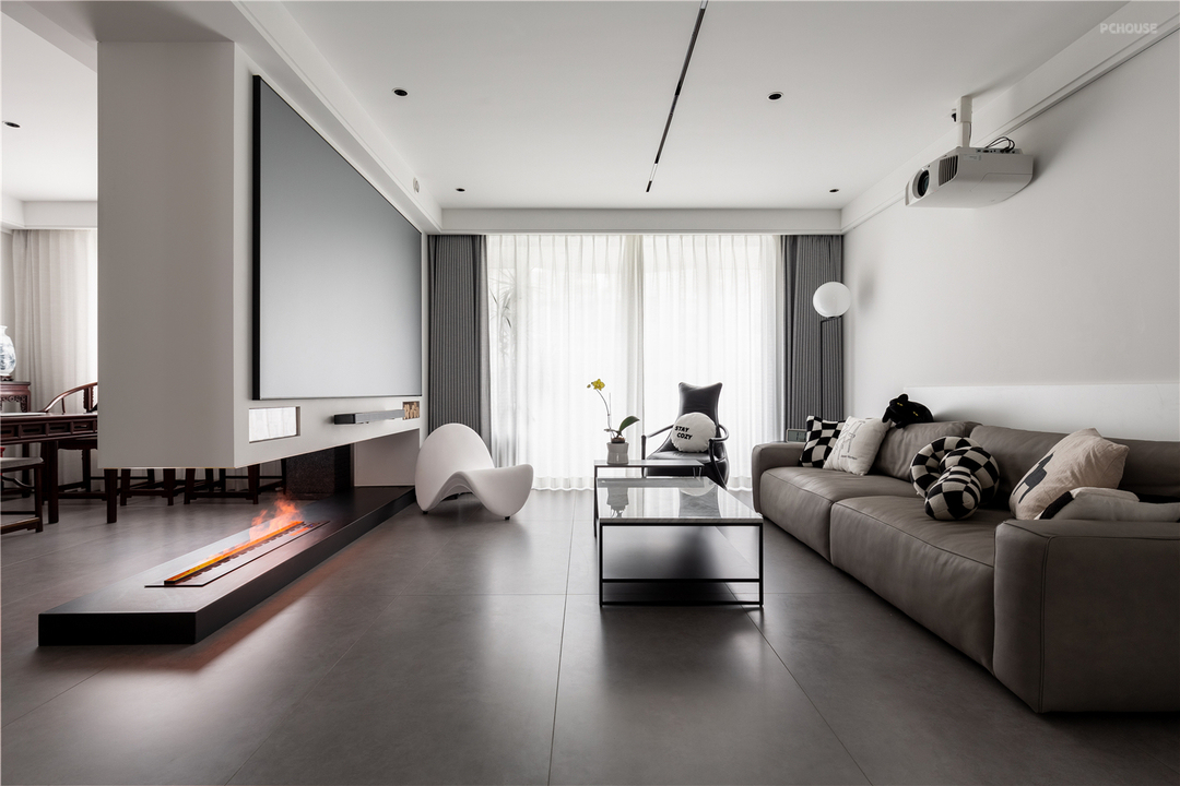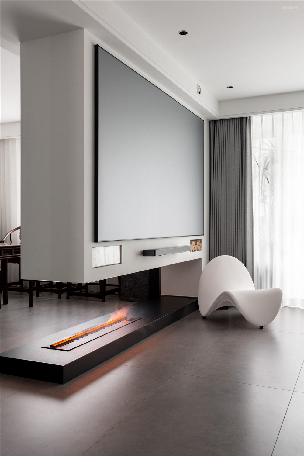 客厅放弃原始的电视背景墙,空间全部打通,用悬浮背景墙做激光投影屏幕,下面做蒸汽壁炉。