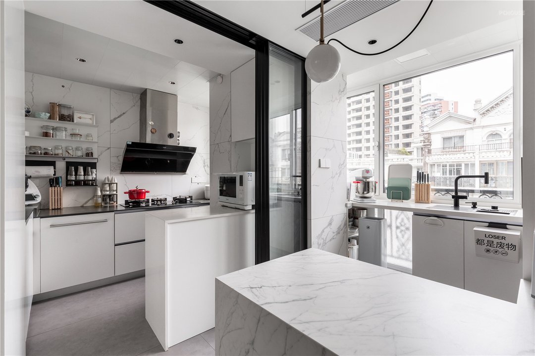 将原户型卫生间位置扩展改为中厨,原有厨房改为西厨,旁边增加厨房专用的独立储藏室,增加收纳的同时也使得空间利用更合理。