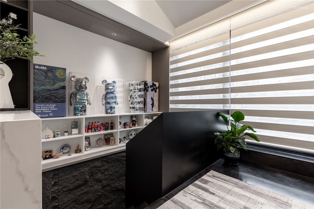楼梯侧面做整面墙的展示柜,增加收纳的同时还可以展示业主的各种收藏。