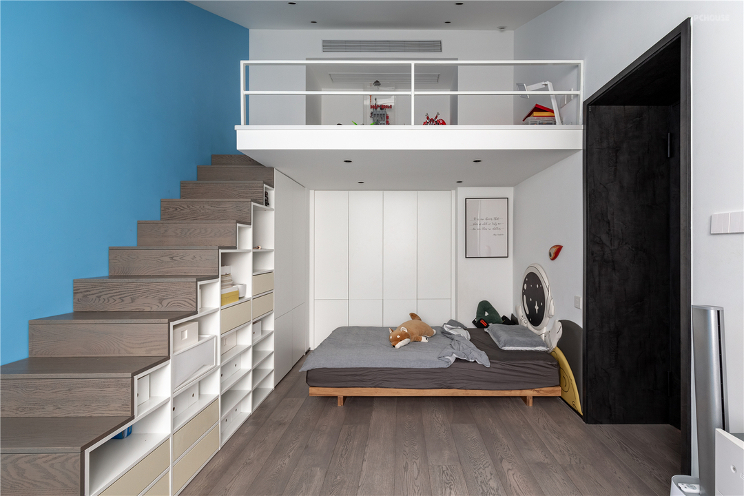 ⑤儿童房做的更有趣味一点,增加阁楼,合理考虑阁楼上下动线和便利,同时满足小朋友书籍储藏和运动的需求