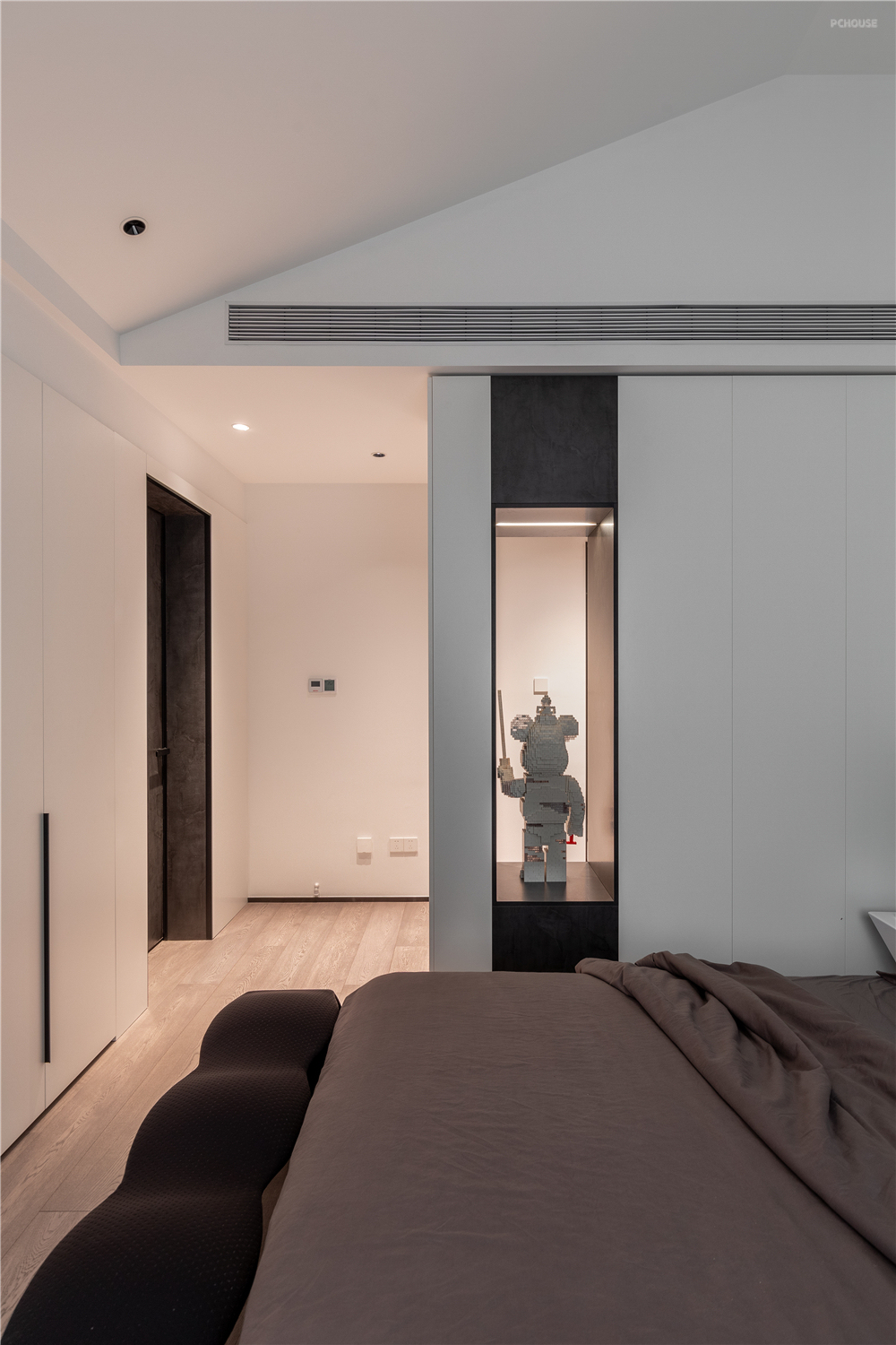 隔断卫生间的衣橱则做了镂空的设计,依然是取景借景的概念,线性灯的光影让空间得以穿透和呼吸。