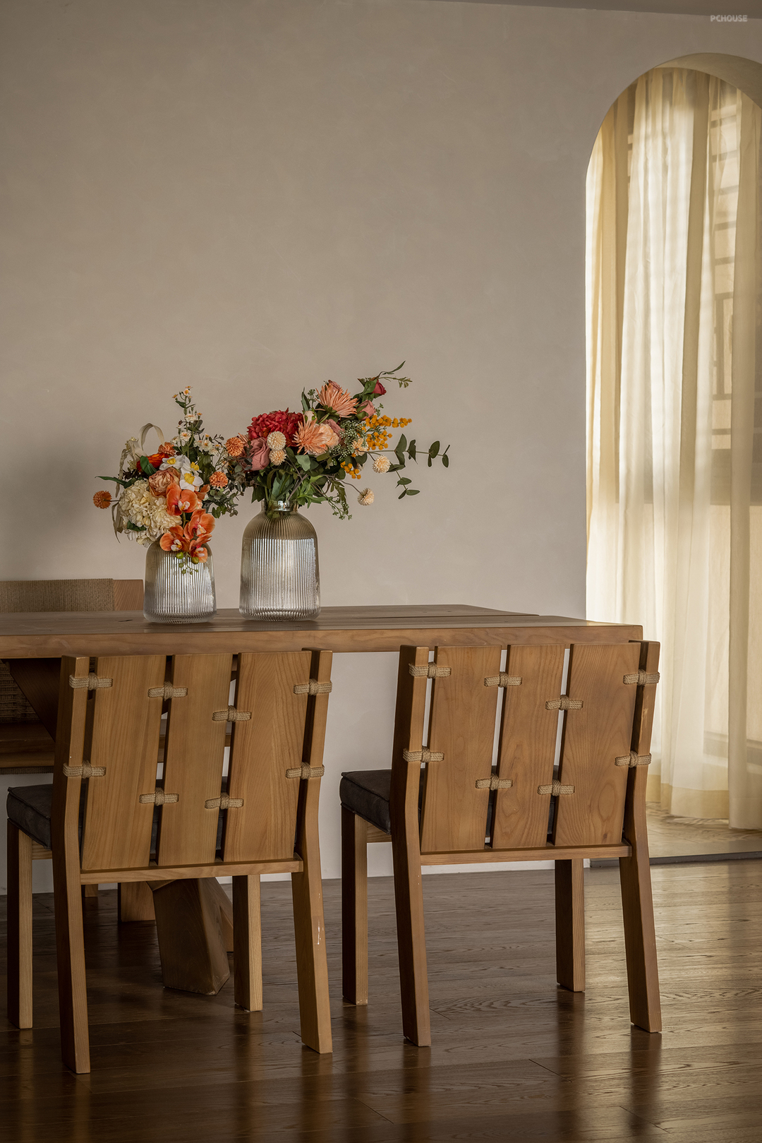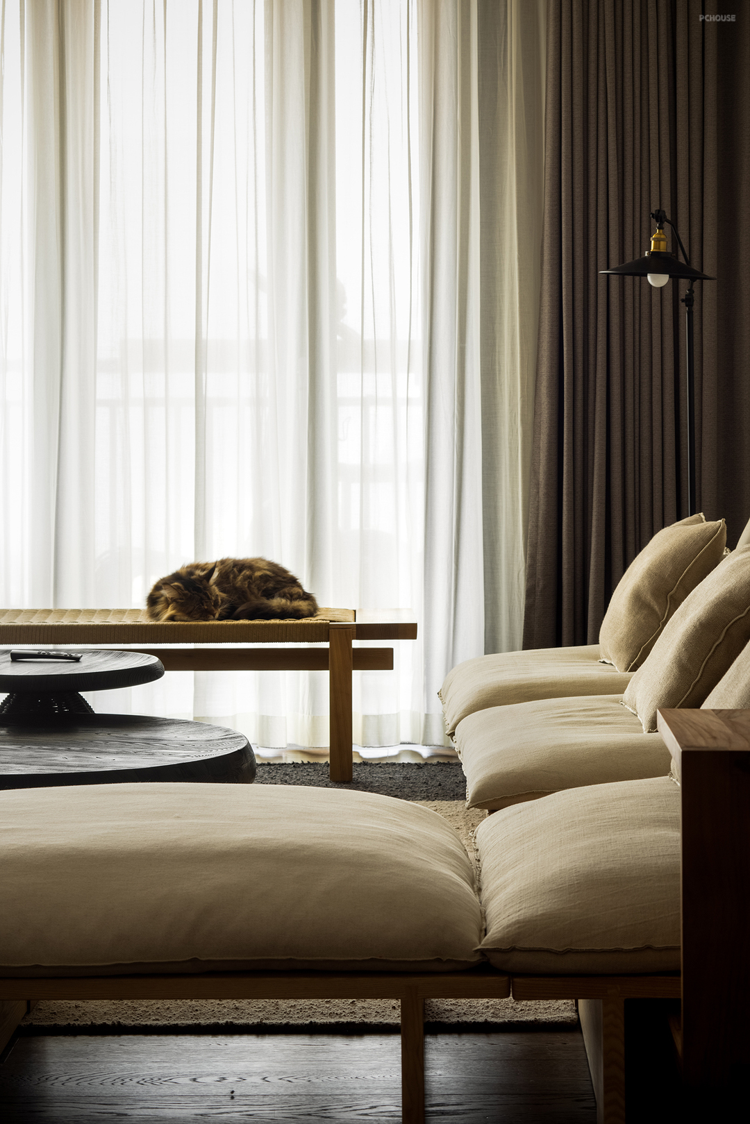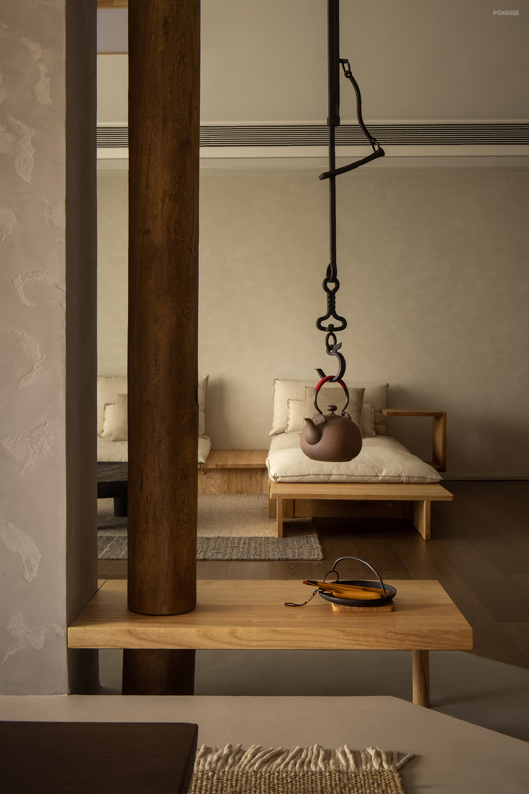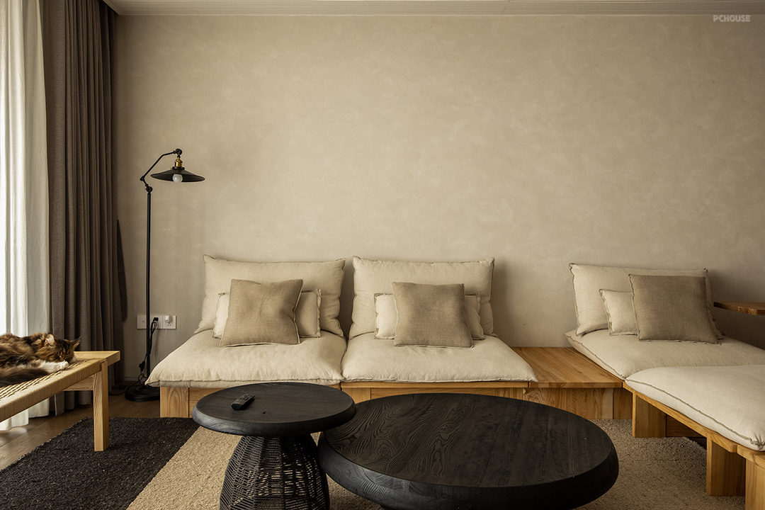 本案是业主通过线上平台找到我们的,项目在广州塔旁边,我们做的远程纯设计项目。业主喜欢质朴且有韵味的中式风格,希望厨房餐厅、客厅及茶室是开放的空间。根据业主阐述的喜好,我们利用空间体现一种哲思,一种心境,一种世界观,体现质朴的生活方式,旧中见贵气,破中显隐奢。以自然色为主,还原事物的本质,视觉上空无一物,通过极少的家具饰品表现淡泊浮华的态度。看似家徒四壁,实则是洗尽铅华人们面对本质的需求。
