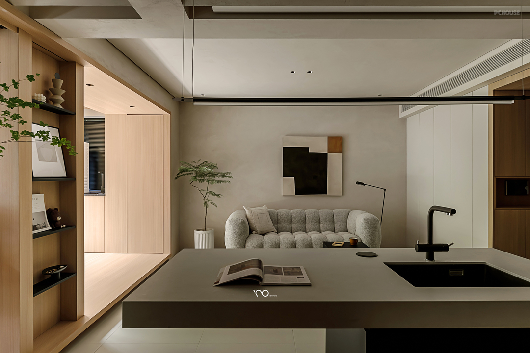 ② 将厨房完全打开,置入大岛台,让原本纵向的块状空间,改成横向的一体式布局;