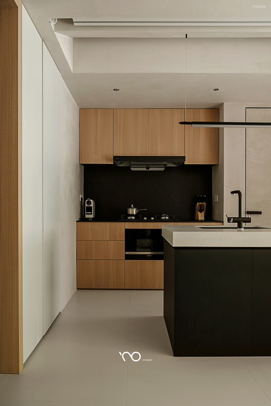 黑色与木色的开放式厨房,有别于其他空间组合。黑色是减法的艺术,去掉生活的条条框框,回归对于功能的直接需求,既便于打扫,又将空间的视觉重心牢牢抓住。而餐岛一体的石材,简约通透的布局,让这里成为屋主就餐、工作和招待朋友的重要场所,被赋予超越居家的职能。