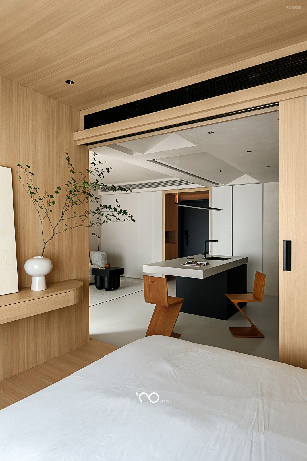 卧室与客餐厅的气场既相互融合,又独立成章,即得自然眷顾,又有侘寂小景作和,用不同深度和纹理的木质从不同角度照见了理想生活。
