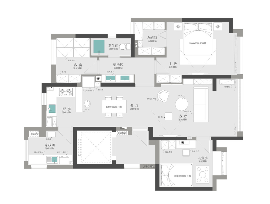 户型改造上,在厨房进行了开放布局增加了岛台位置,增强了收纳管理同时在视野上也相对开放,单独的家政间统一收纳管理,打扫工具,洗衣晾晒,家务工具和不常用的物件可以归置在此,卫生间以干湿分离的方式呈现,双台盆可以满足早起共用的需求,客房以收纳为主,兼顾零时居住。在客厅和主卧之间以墙体折叠方式做两面收纳,满足局部储藏和展示需求。