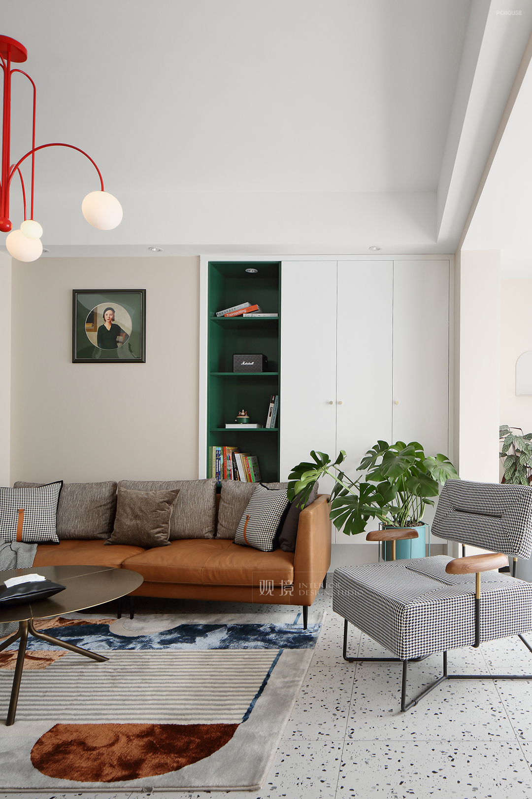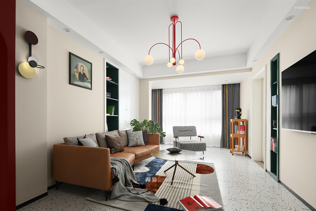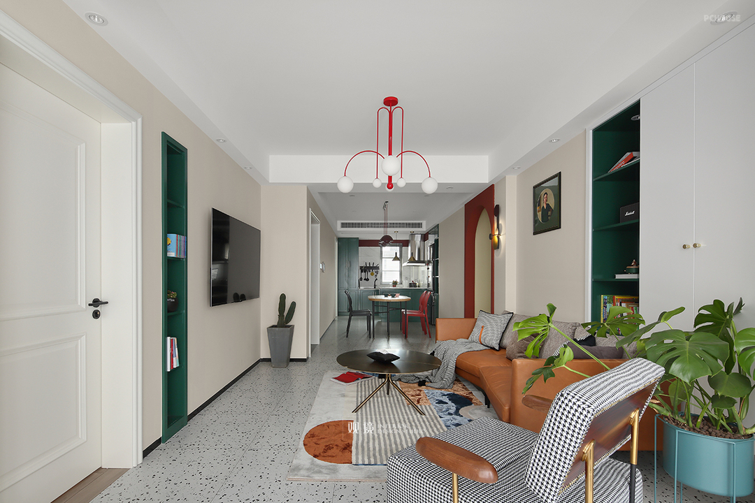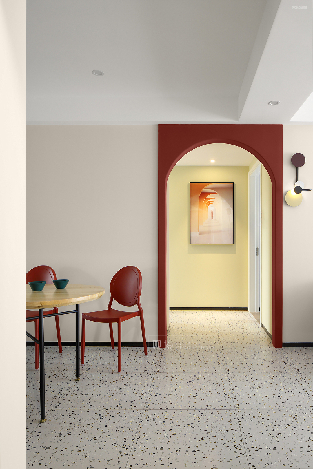 客厅沙发后墙面做了一面两用墙,一面给客厅用,一面给卧室做补充,红色的主灯呼应拱形门洞,视觉形成联系关系