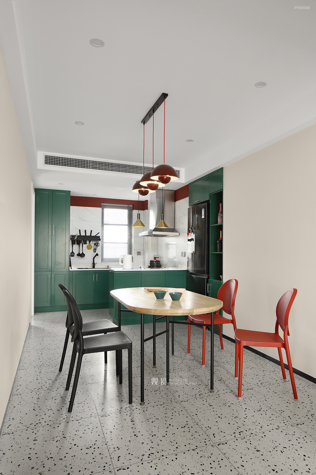 厨房在对比原始户型可以看到有比较大的调整,原始户型比较狭小,调整后厨房使用空间放大,视线和烹饪氛围也更加融合,和家人互动性更高,整体配色以绿色为主,白色红色点缀,既有明快,也更热烈。