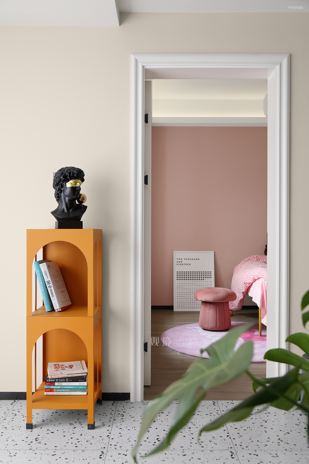 地面水磨石地砖以及墙壁顶面素雅的环境中,整体家具在其中亮色点缀,宁静中略带有俏皮。