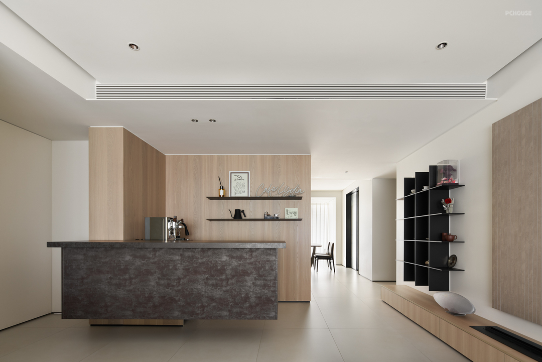 水吧后的墙体既是水吧背景墙也是客餐厅的分界线,木制元素在空间中纵横交错,彼此呼应将空间连成整体,独立与交融并存。