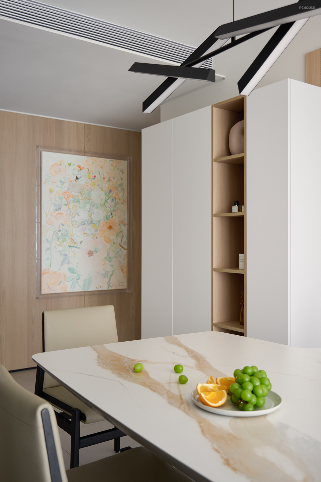 通过大量留白减少繁杂,用材质和色彩的碰撞留下纯粹的视觉感受。极具现代感的餐厅吊灯,六点光源可以切换角度,光源更广更多变。浪漫的花卉油画可以让用餐氛围更轻松舒适。