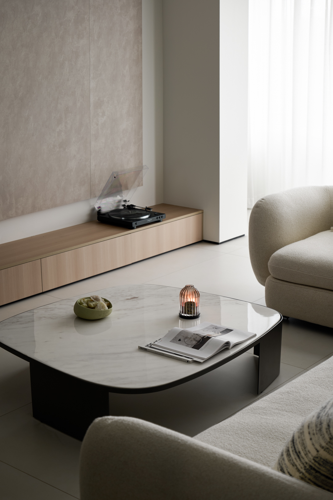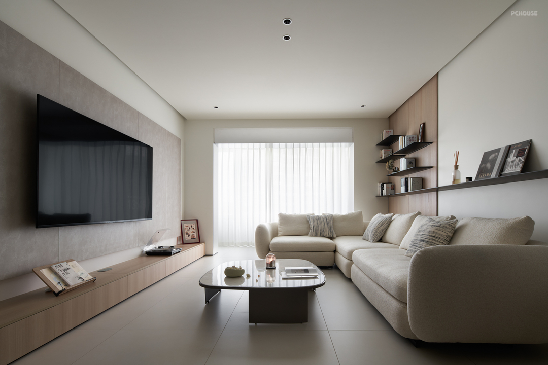 拆除原有精装房的墙地面装饰,房子回归最原始状态,重组空间脉络的同时,根据空间调整色彩节奏。大面积的浅色哑光地砖搭配原木色墙面装饰,再通过局部摆饰的点缀,改变空间气质。