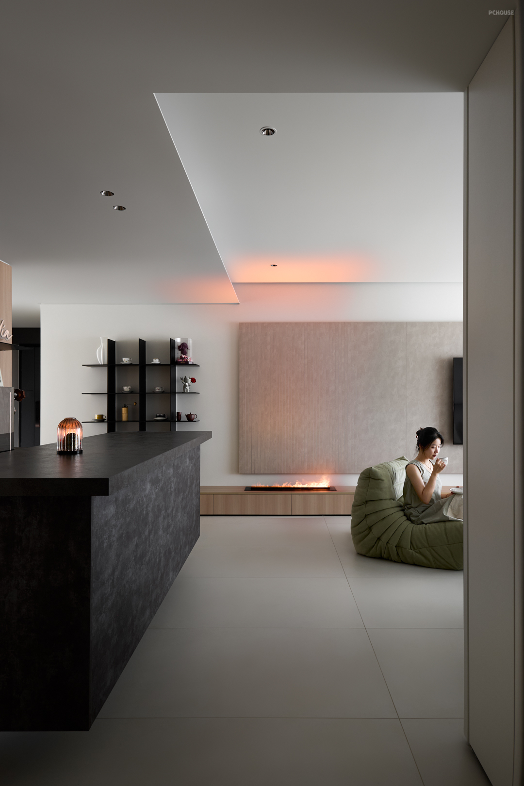 电视背景墙通过竖直的抽缝,将墙面比例切割,和过道相呼应,比例更和谐。氤氲的壁炉火光弥漫开来,温暖整个空间。