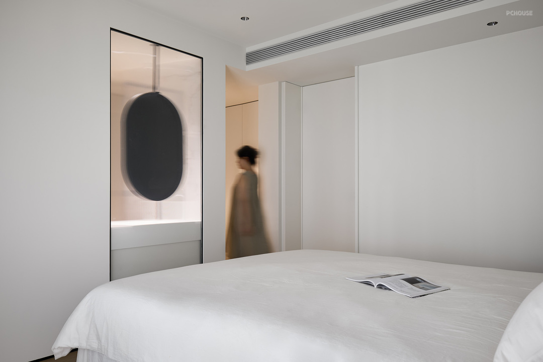 平时一人在家时,移门打开,空间通透彼此互通。朋友来访,多功能室还能作为第二个会客厅使用。如若陌生人到访,拉上移门,保证空间私密性