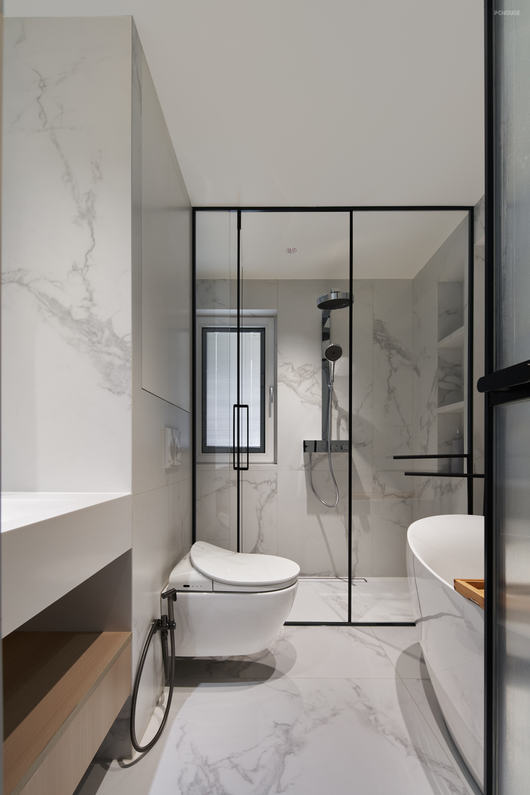 错落的黑色超薄钢板横向延伸,与木饰面的纵向延伸结合,横竖间平衡墙面比例。