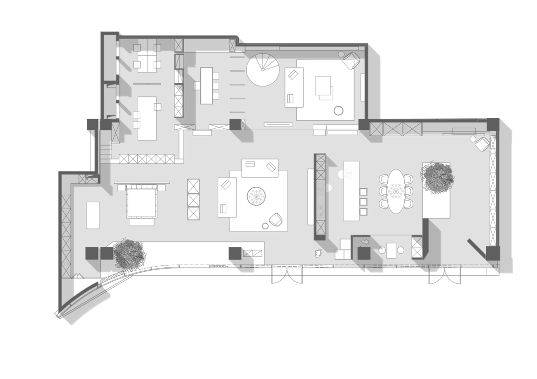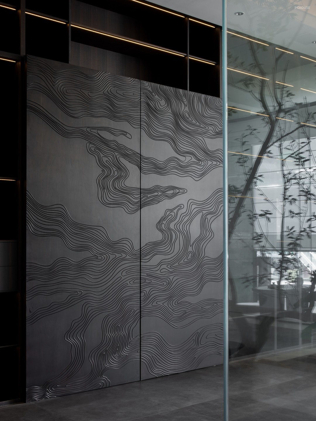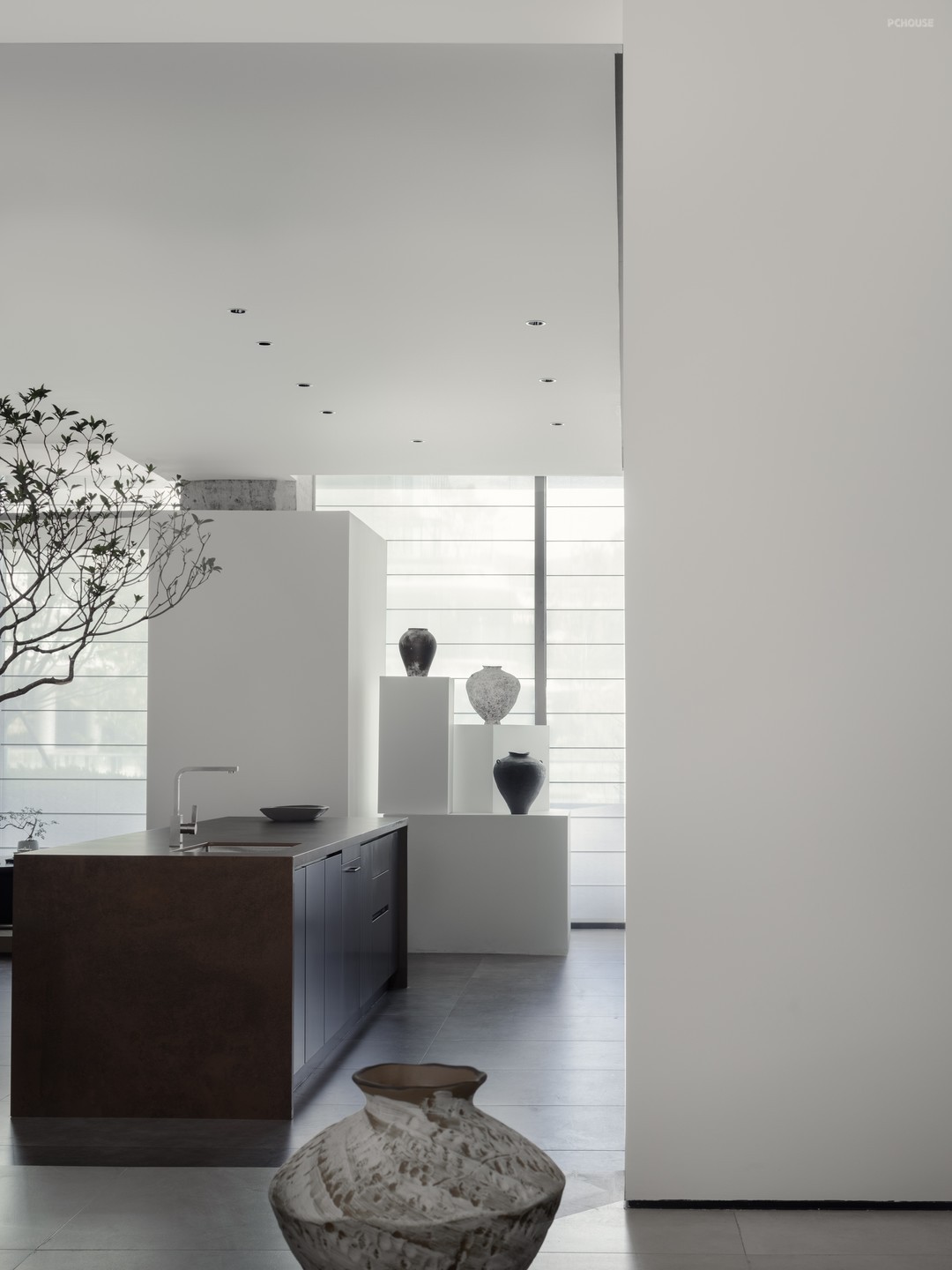 书房区域顶高的装饰书柜背景下,与玻璃内自然装置的呼应,自然趣味的引进,植物空间的穿插连贯,顶上太阳光的灯光设计,即增加了植物的光照又拉伸了空间了高度,又让区域与区域之间起到分割,同样又是追寻的主题,道的根源就是自然与生活的统一。