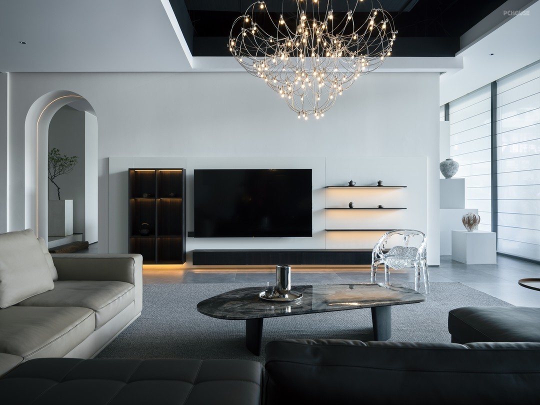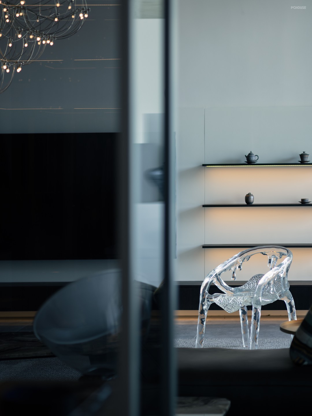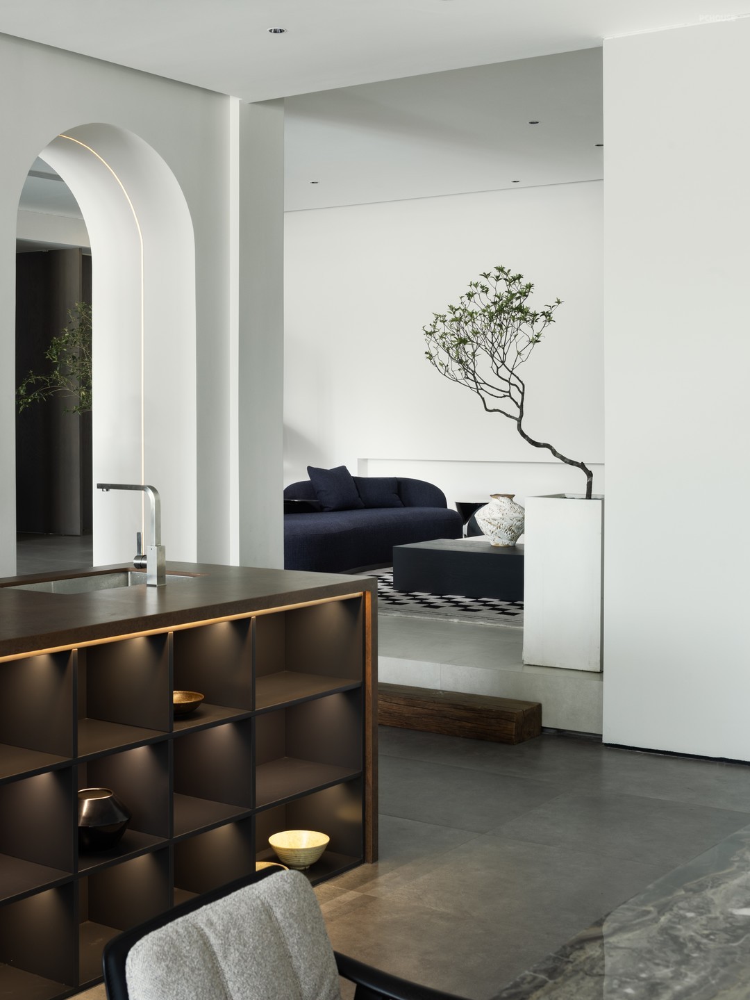 地台上下错位的空间穿透和一地做垫,台阶下口灯带的连贯,更增减了餐厅岛台区域和客厅区域以及茶室区域的连贯,又增加空间错位的穿透感。