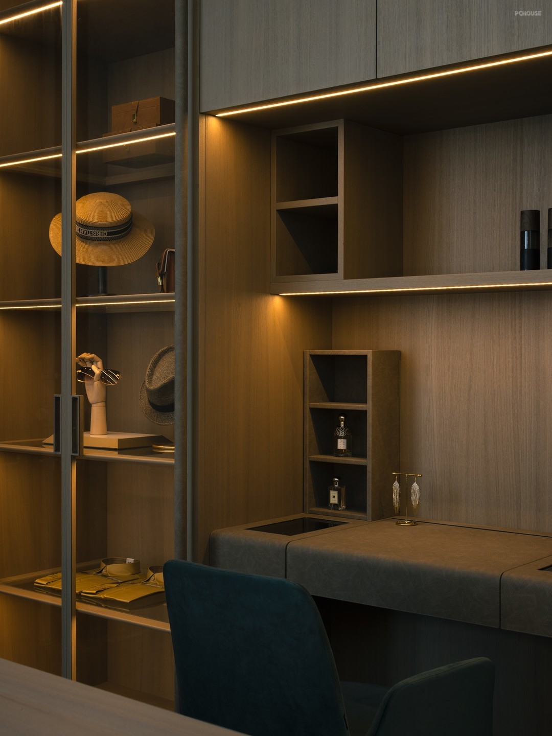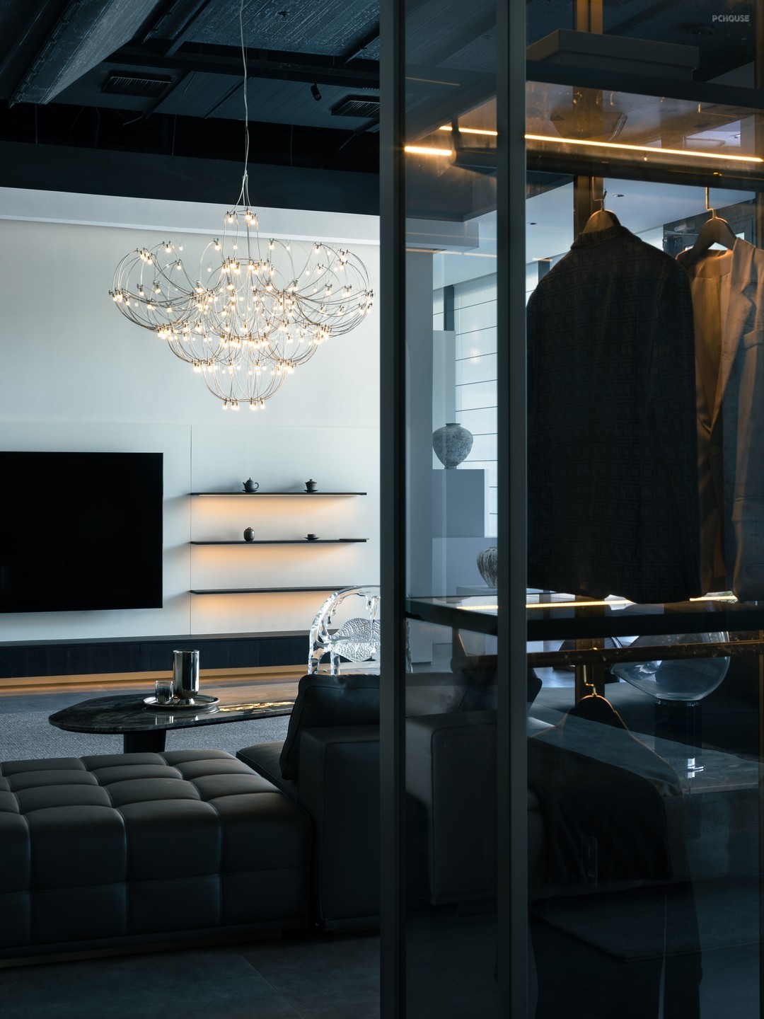 大客厅的大视角与卧室衣帽间的互通,设计宗旨在考究是套房的概念设计,客厅与卧室中间用一个玻璃开放衣帽柜做隔断,顶上用一根无线的灯带贯穿,两边即互通光影视角穿透,又能相对独立,保证每个区域的完整性,衣帽间与卧室空间来说,两根毛胚原生态柱子和衣帽岛台,即分割了区域,又是同一个区域,衣帽间顶面空间高度做了一个拉伸,增加了空间上升,又能显得我们衣帽间磅礴大气。