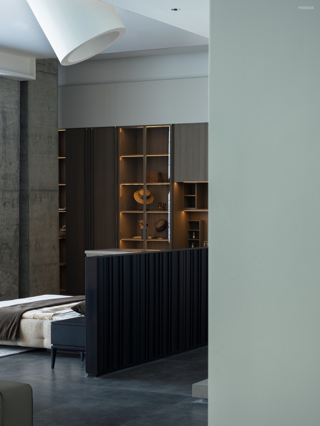 卧室边上休闲橱窗区域,低垂的小叶植物,和弧度柔合的浴缸左右搭配,一高一低,空间错层视角延伸,把室外的视角同样贯穿辐射室内,床后面的吊挂式墙壁和侧面的楼梯样品灯光区,踏步和平板的错位连贯,也同样让空间有更多的穿透延伸性。