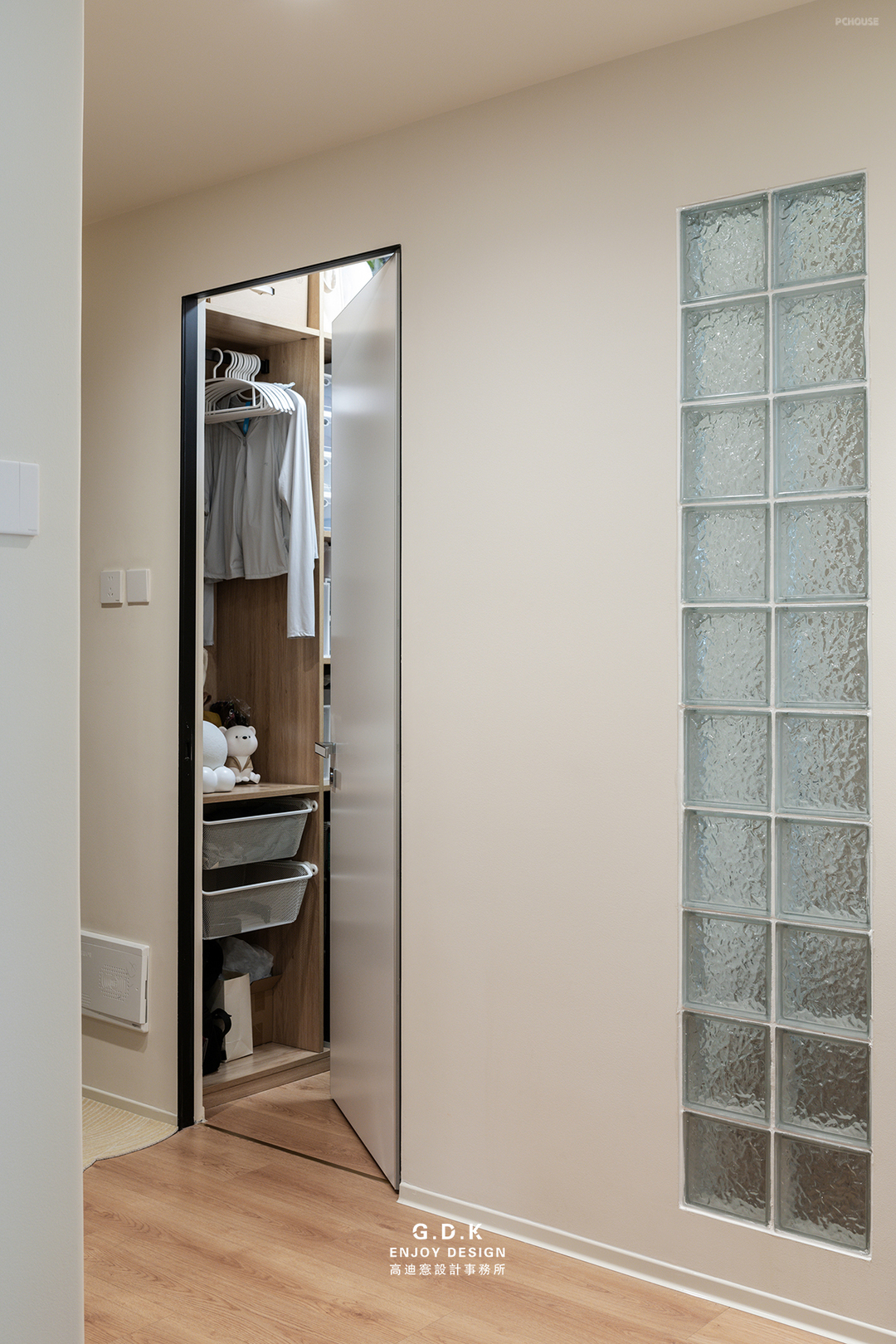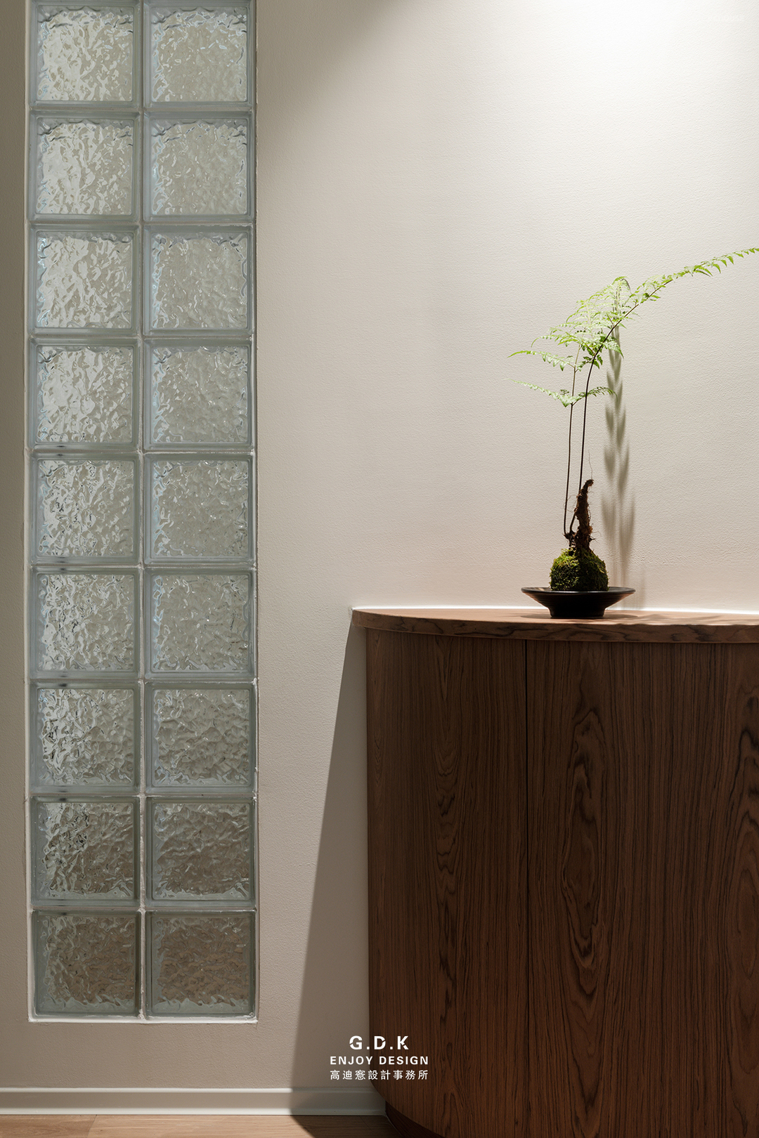 进门正对一面弧型墙体,自然的将动线引导至客厅,弱化了空间棱角和边界感,同时玻璃砖的置入让空间更通透。