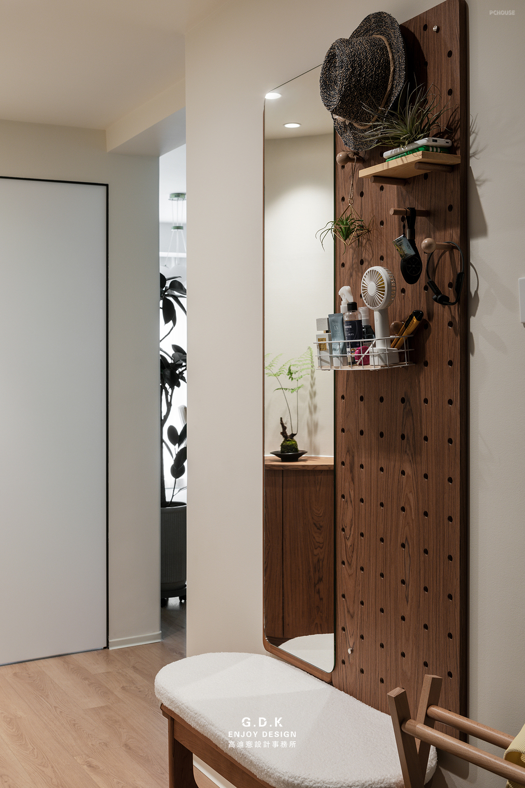 墙侧增加洞洞板置物架,用来挂包包、钥匙等随手小物,同时胡桃木色与端景薄柜呼应,让空间更丰富统一。