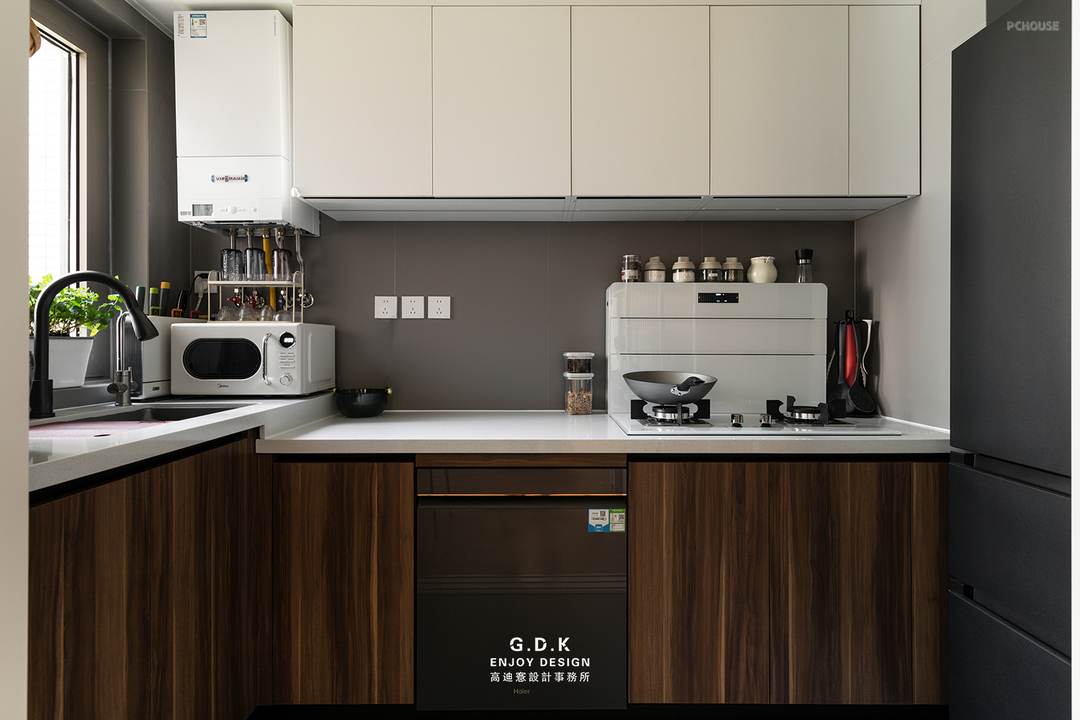 厨房合并了原先的生活阳台,改造后的“L”型操作布局,收纳能力强,空间也更开阔采光和通风都得到提升。