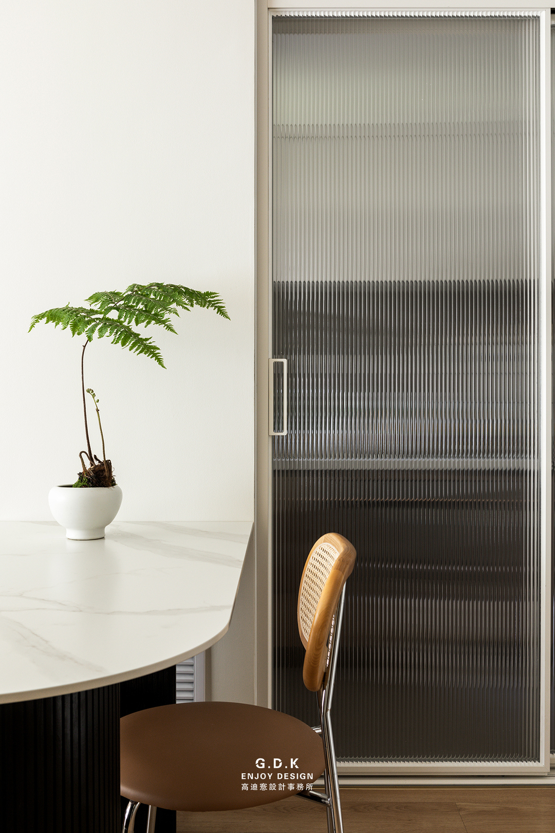 餐厅与厨房之间通过玻璃推拉门分隔,可以根据实用场景选择开放或封闭,打开就是一个开放式厨房,朋友聚餐或做饭时,不同位置的人都可以无障碍的交流。