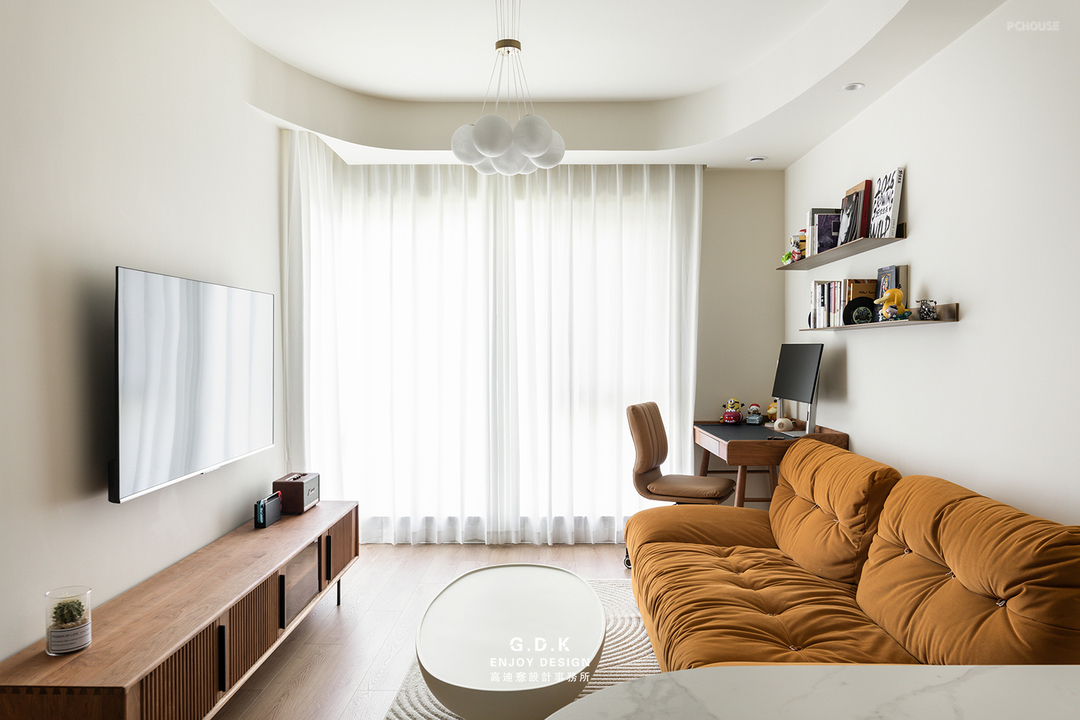 ④ 顶面利用弧形吊顶引导动线,让不同功能区衔接更流畅。