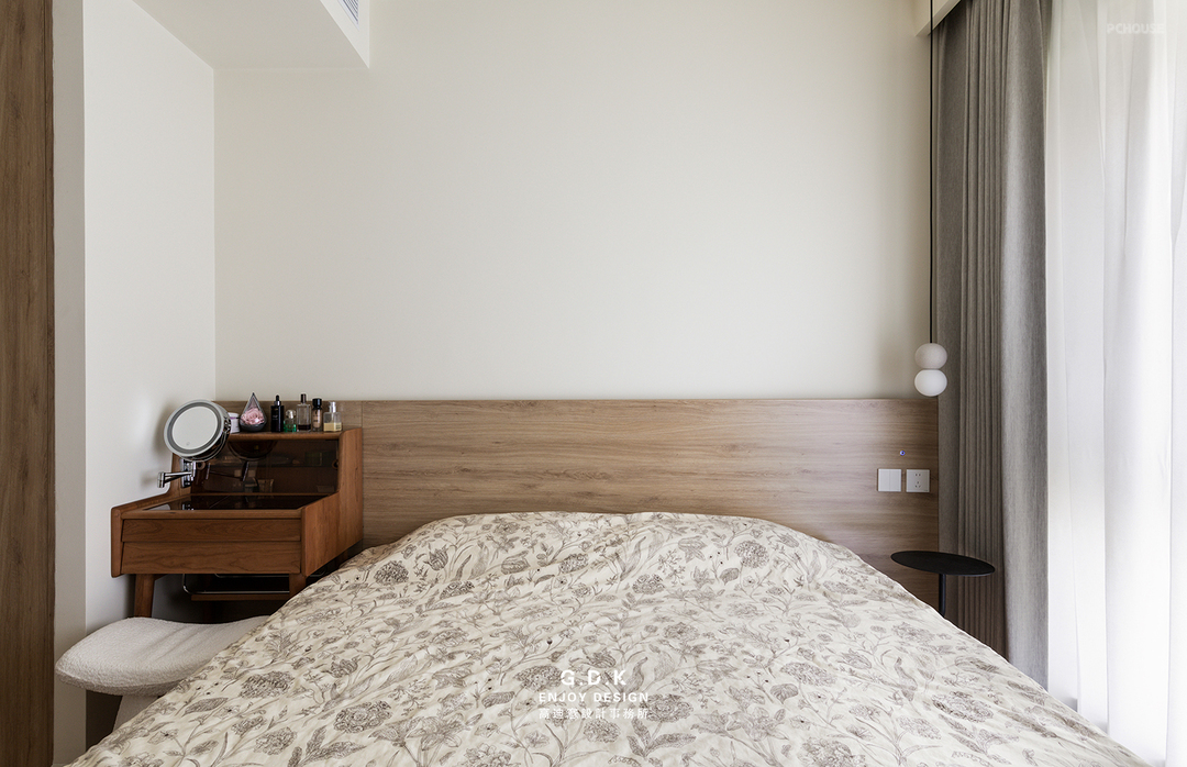 卧室延续了整个家的色彩基调,没有过多装饰,原木色半墙饰面,线条干净利落。
