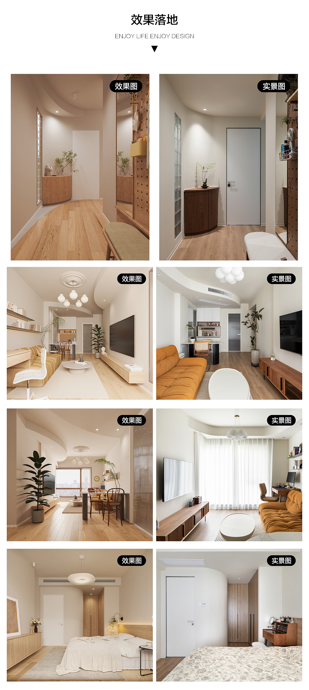 由玄关向内,转入开阔的客餐区,弧线的连接、转承,过渡自然流畅,搭配偏暖调的奶油色,呈现柔和轻松的环境氛围。