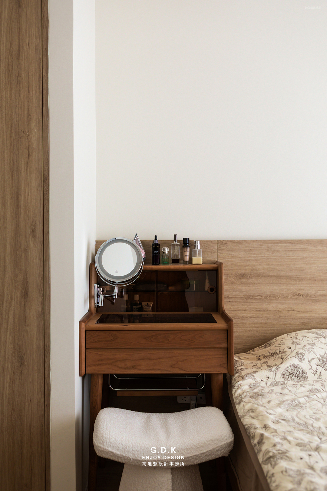 改造后的卧室增加了一个"L"型步入式衣帽区,弧形墙面弱化了阳角,减少小面积的狭促感。