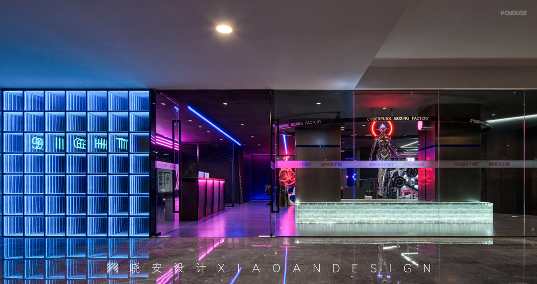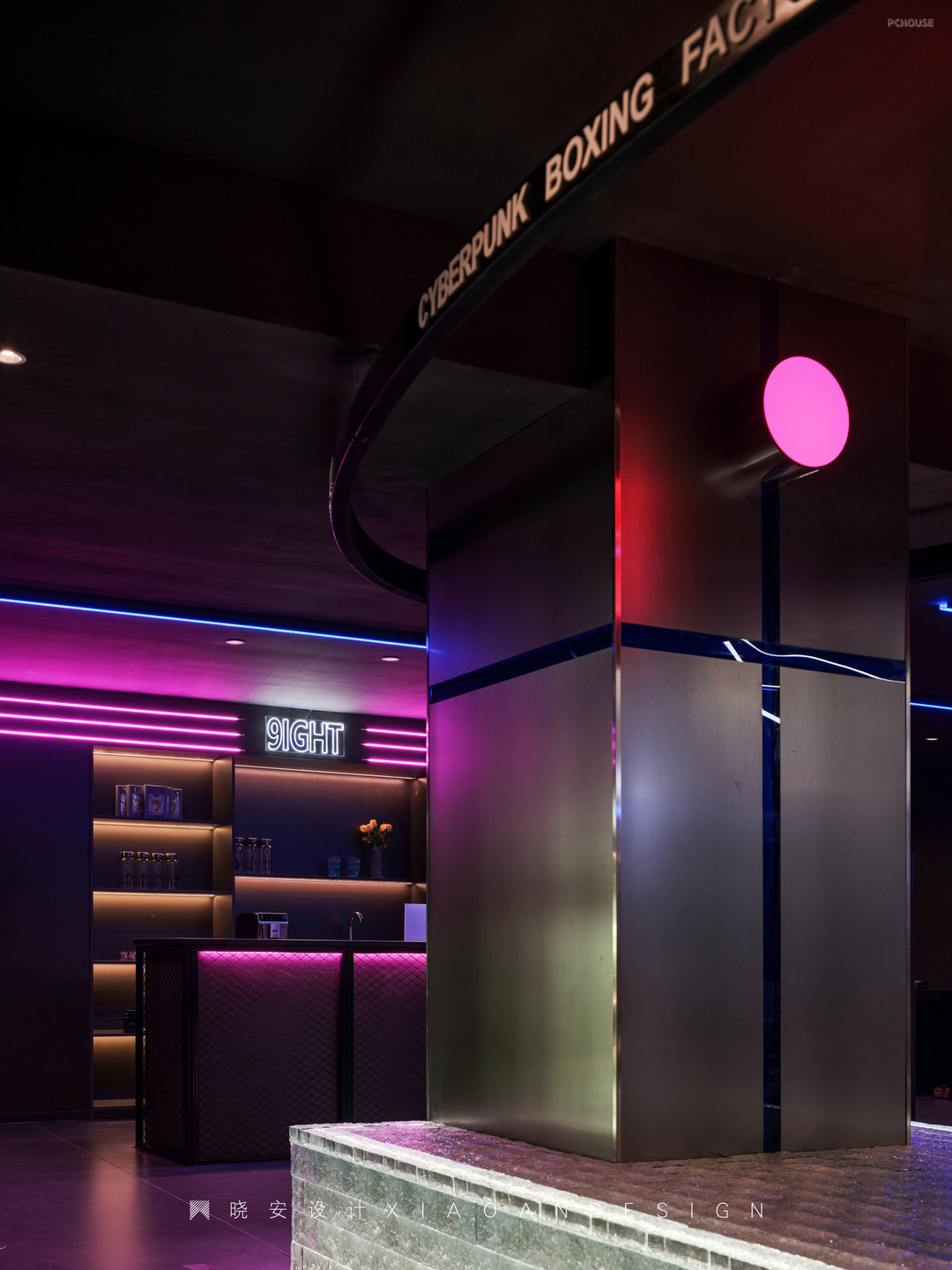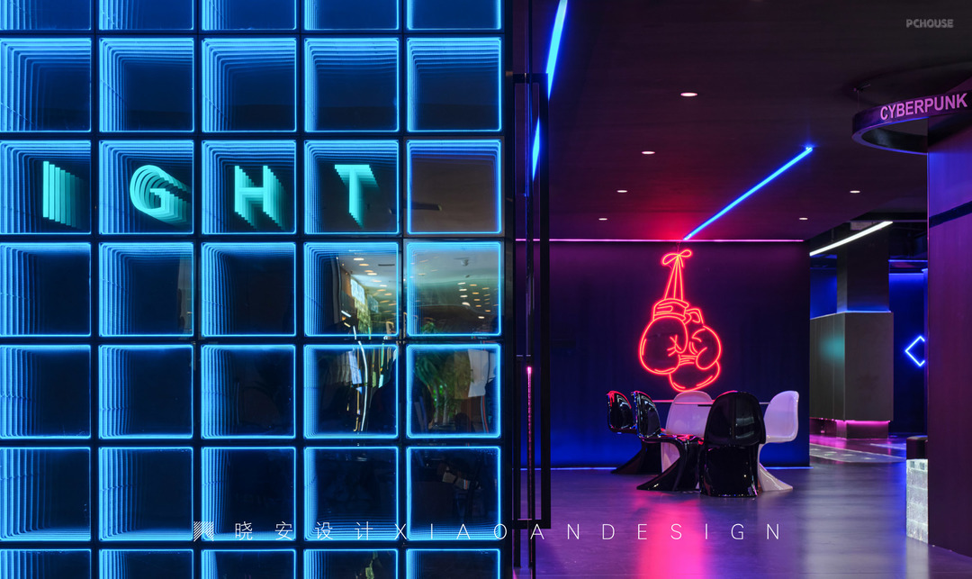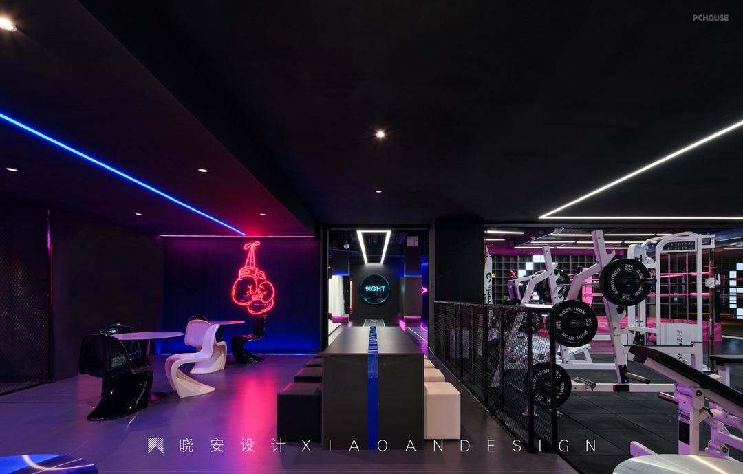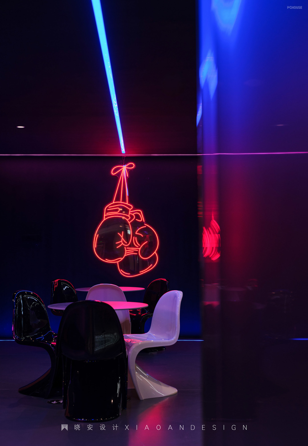 汲取黑白配色的魅力与简约笔法的优雅气质,勾勒座椅线条,流露灵动的精致感,却又在背景墙上绘就霓虹灯拳击手套,重塑休闲时光的意趣。