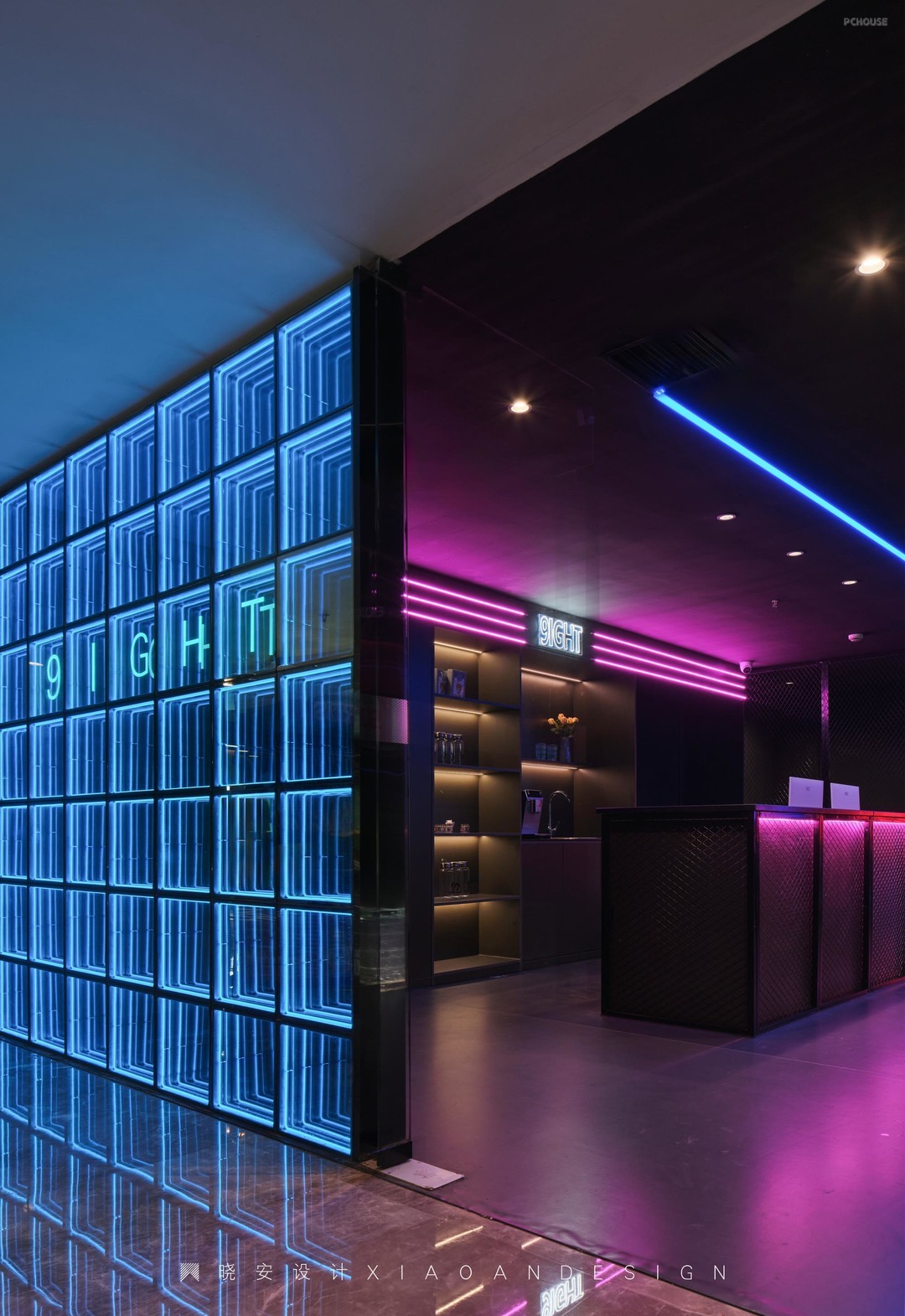 精心挑选光源色,外部的水蓝色系光负责凸显品牌标志,内部的玫红色系光,则带来亲切感与温柔感,不燥不冷,契合着前台所包覆的服务性功能。