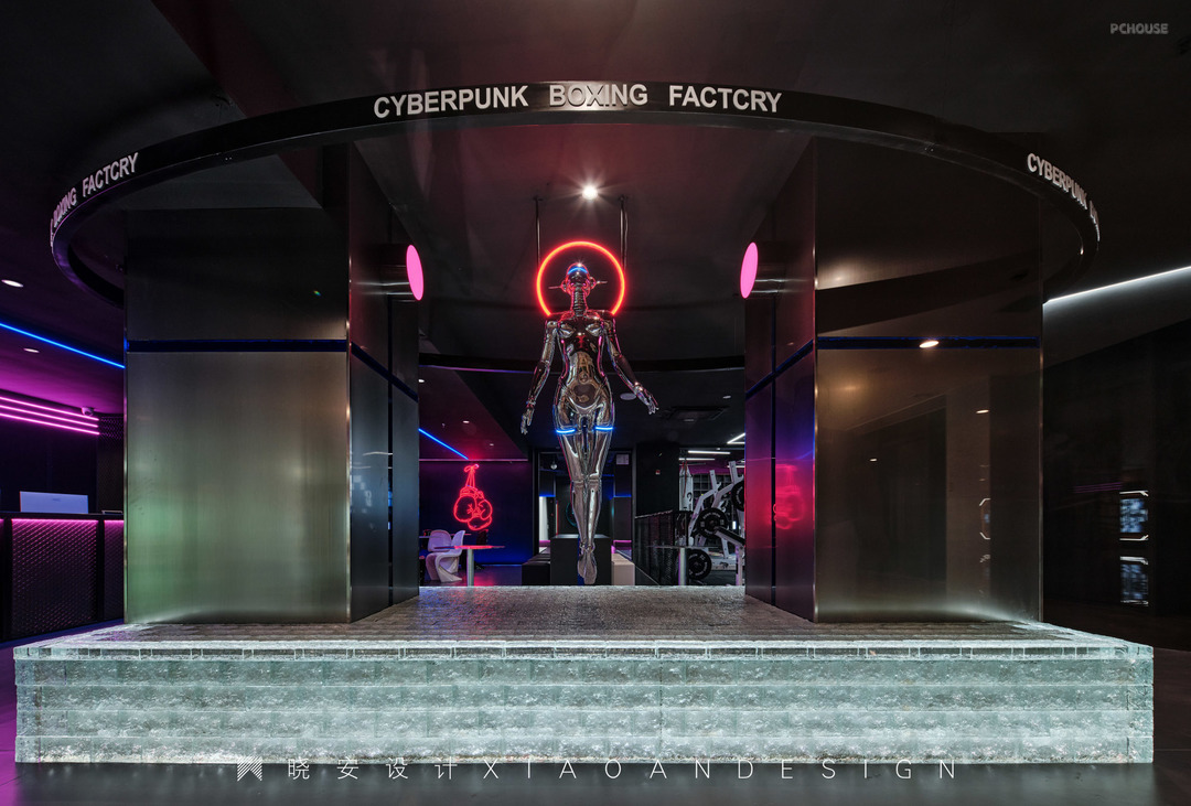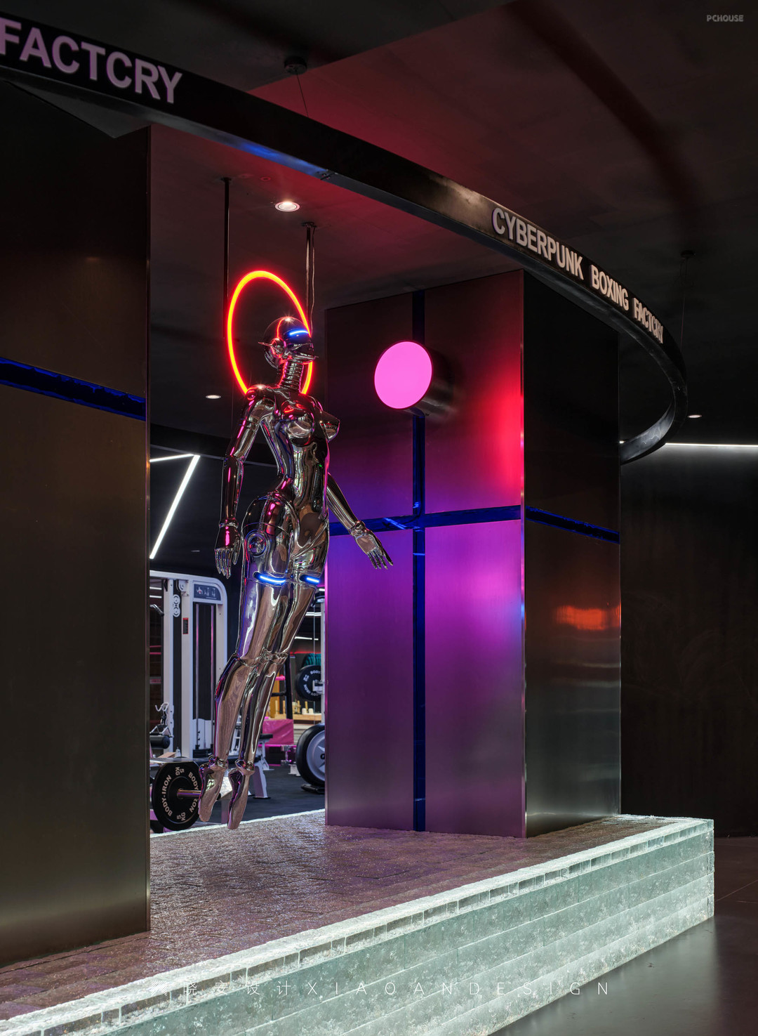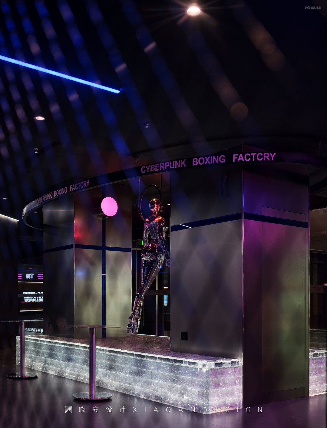 围绕体块叠加休闲卡座,渲染一层清薄的冷光,中和了激烈撞色带来的刺激感,犹如精致庄重的大舞台,承载着以空山基创作的机械姬雕塑为主的潮流艺术,既是入口的视觉焦点,也是品牌形象的有力表达。