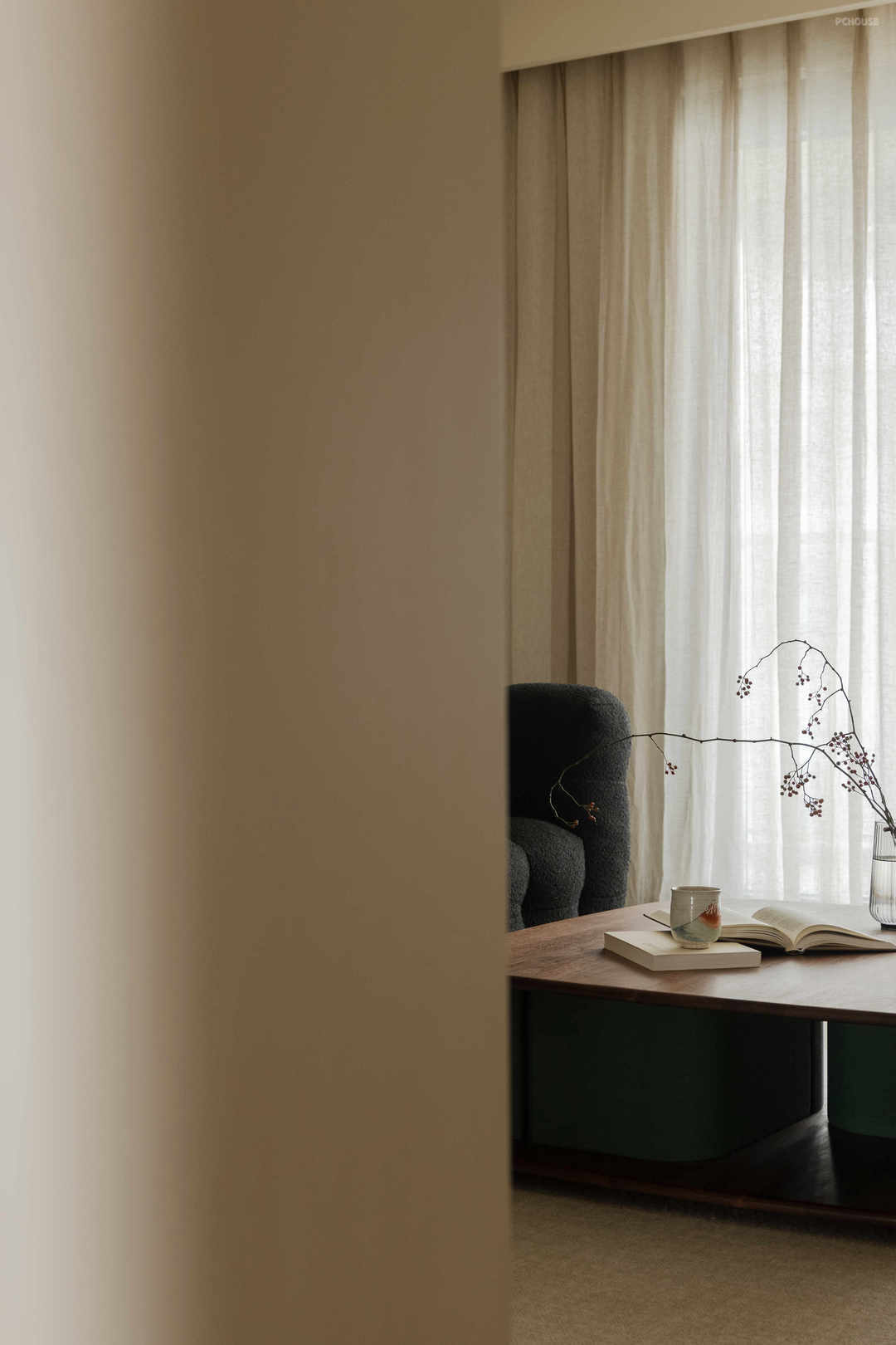 ●镂空隔墙的阳角做了导弧处理,茶几台面、箱体都有导圆,让空间柔和下来。
