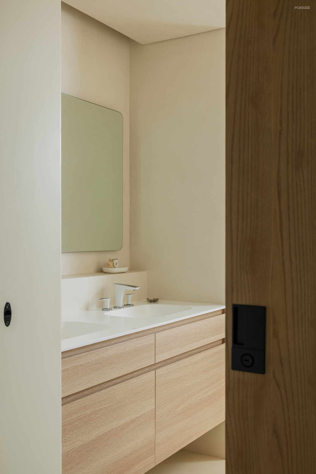 ●双台盆的浴室柜使用可丽耐制作的台面一体盆,后期方便打扫清洁。