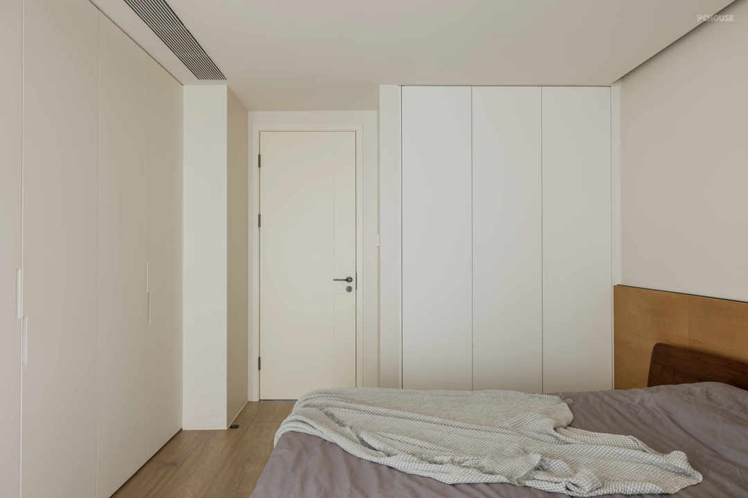 ●主卧在床尾、侧面都增加了衣柜收纳,柜体内部加装了感应灯带辅助照明。