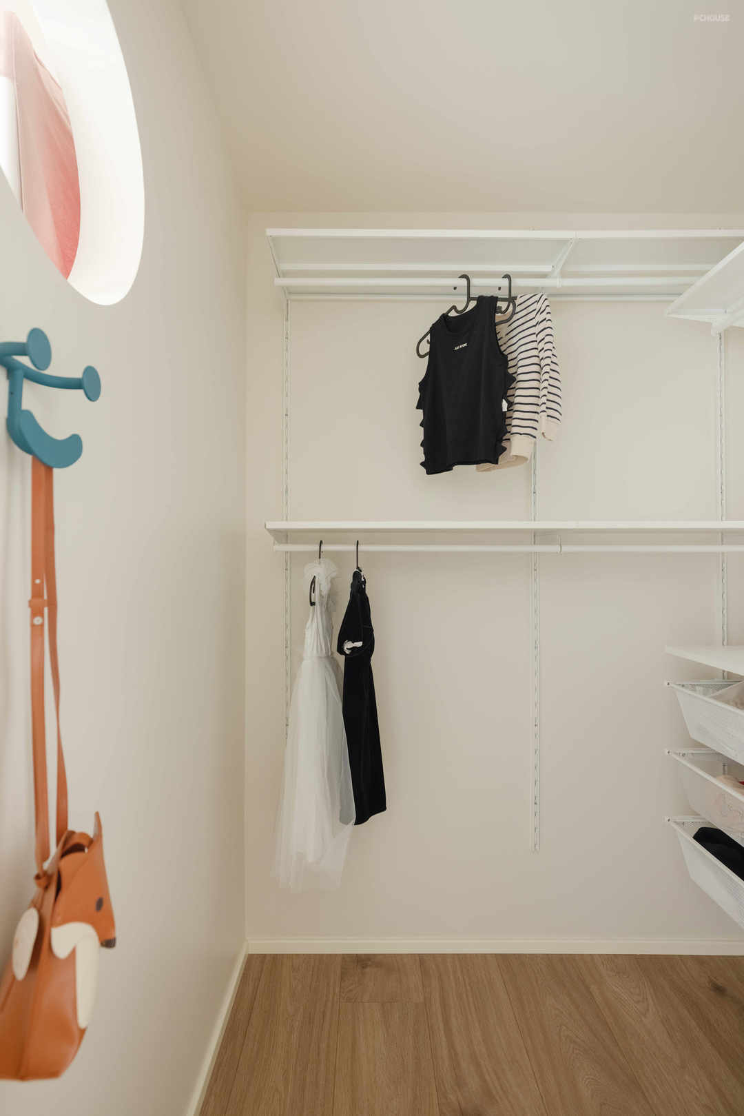 ●衣帽间使用了墙面隔架系统,空间不压抑,拿取也方便,,后续隔架的高低也可以随着小朋友年龄的增长而调整。