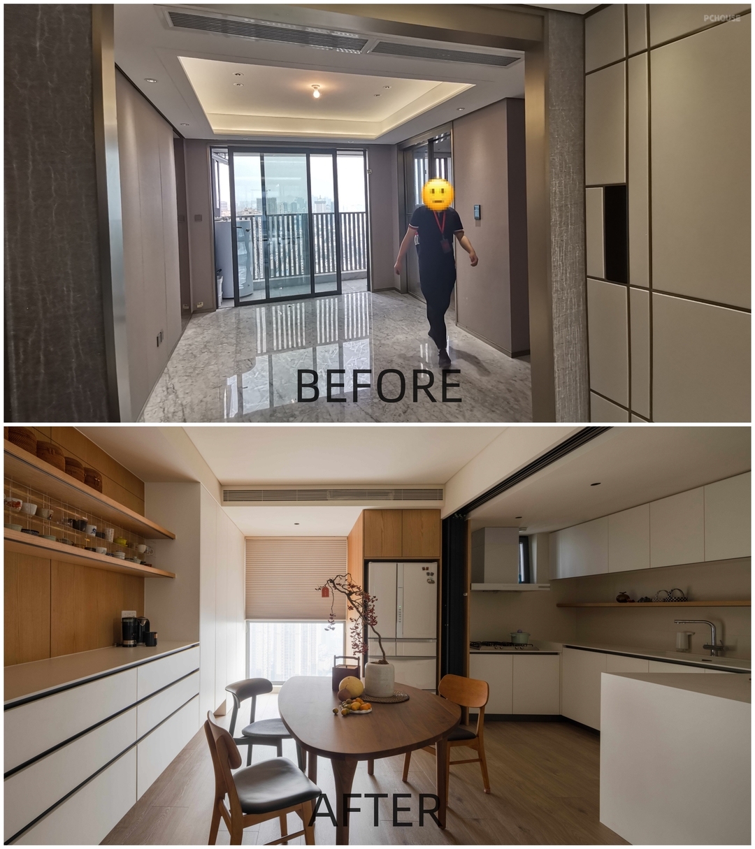 ②厨房改为半开放式,餐厅靠墙处设置高柜、餐边柜,增加大量储物,压缩餐厅窗户以放置冰箱,冰箱后面通过隐形门隔出清洁间。