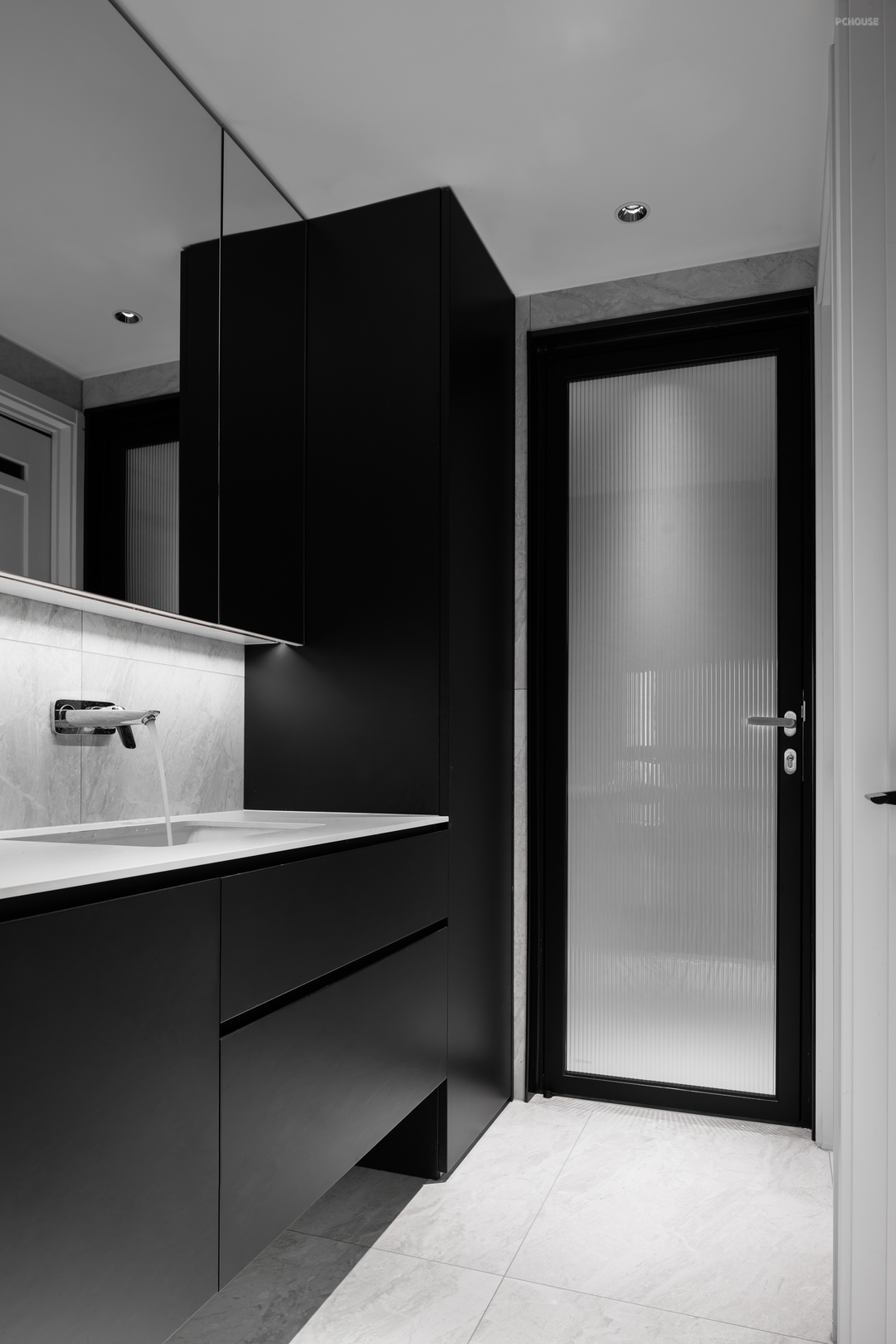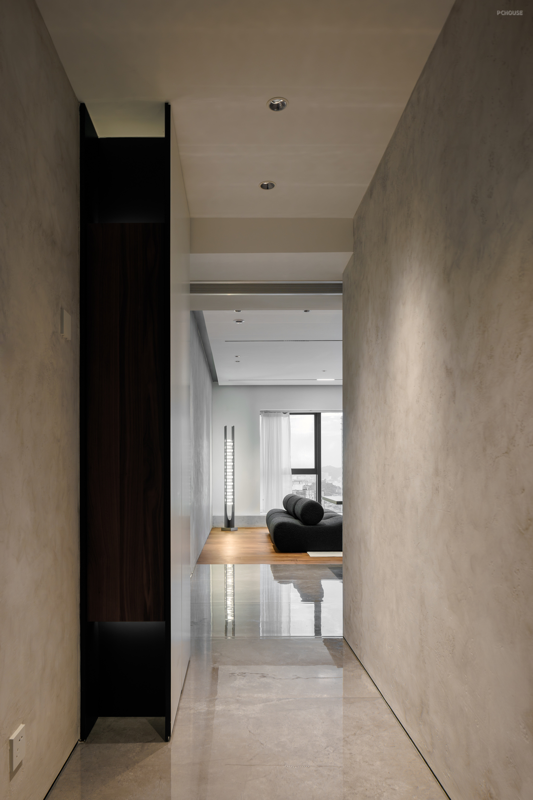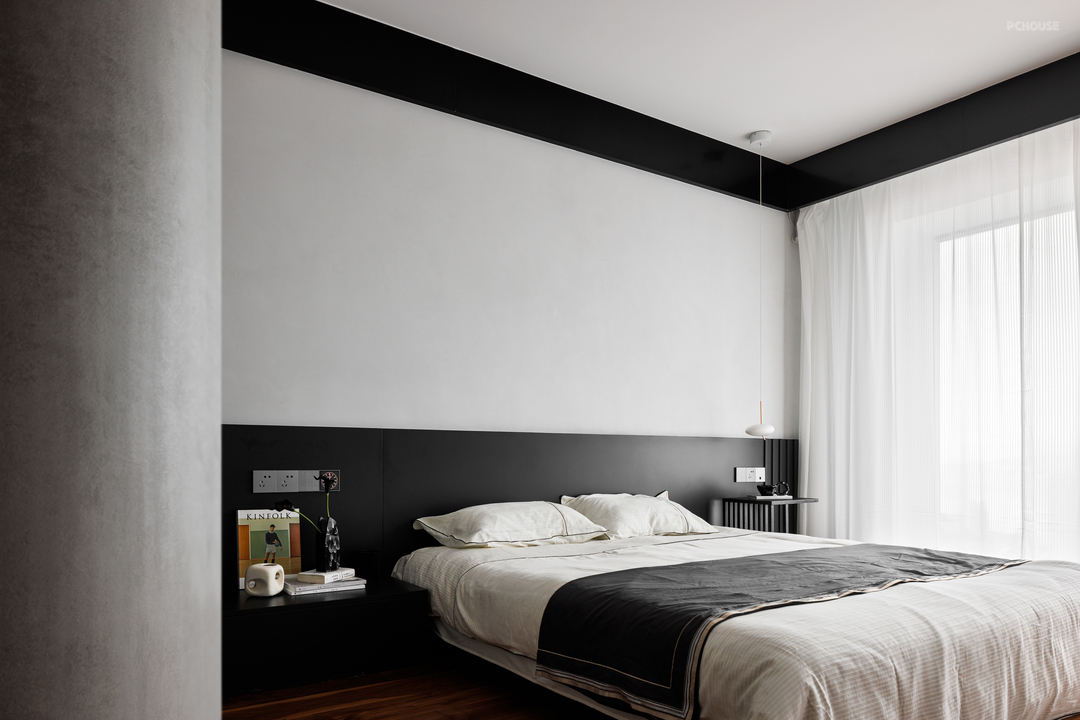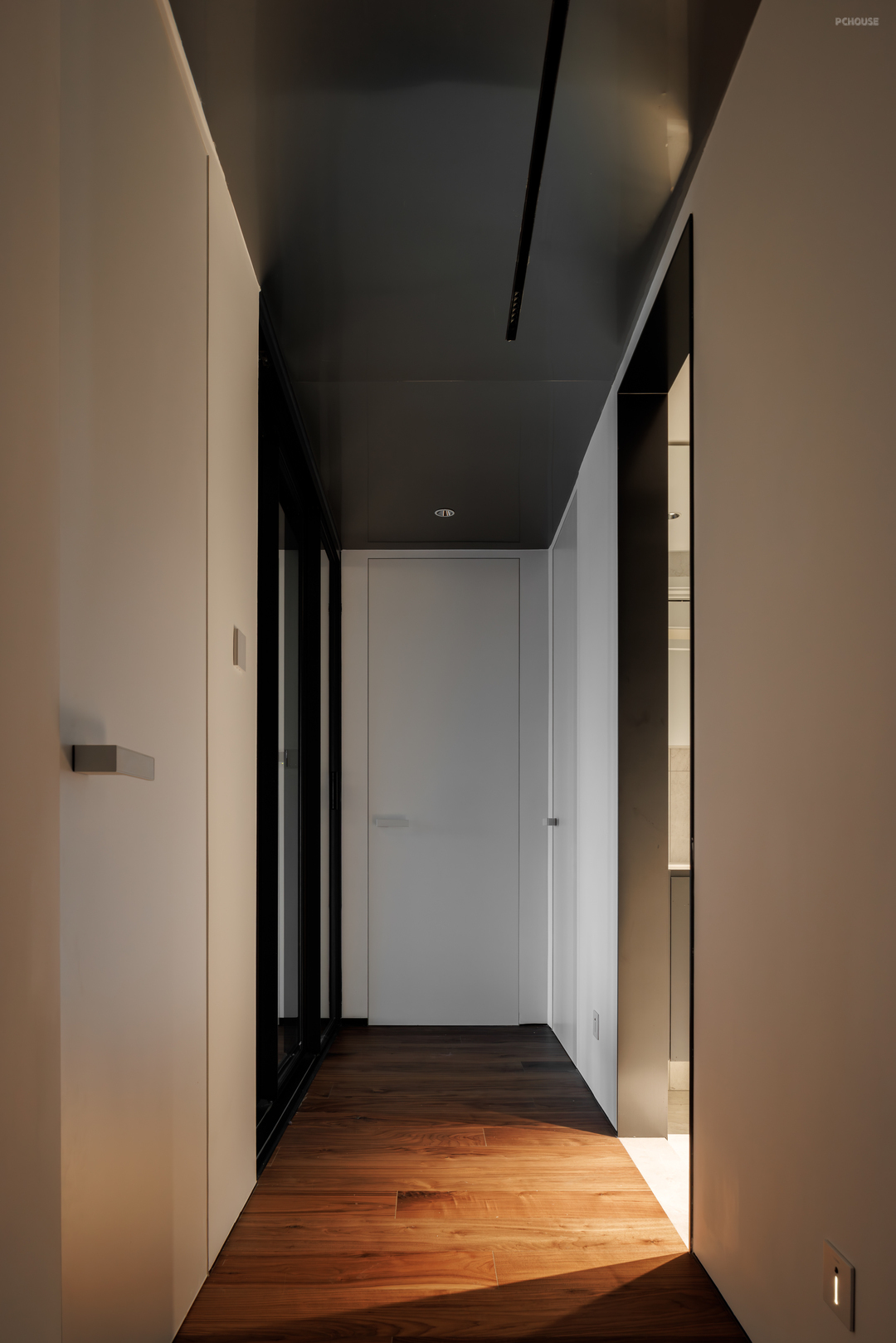 从公区转入私区,有一条Z字型的走道,原本常规的走廊,在设置了墙体的艺术涂料,选择了与木地板呈现出材料上反差的金属吊顶,并刻意压暗空间的光源后,将幽暗的行走经验转化成家中的艺廊空间。即使是一个次要空间也如此重工装饰,突显了主人对这个家的精益求精。
