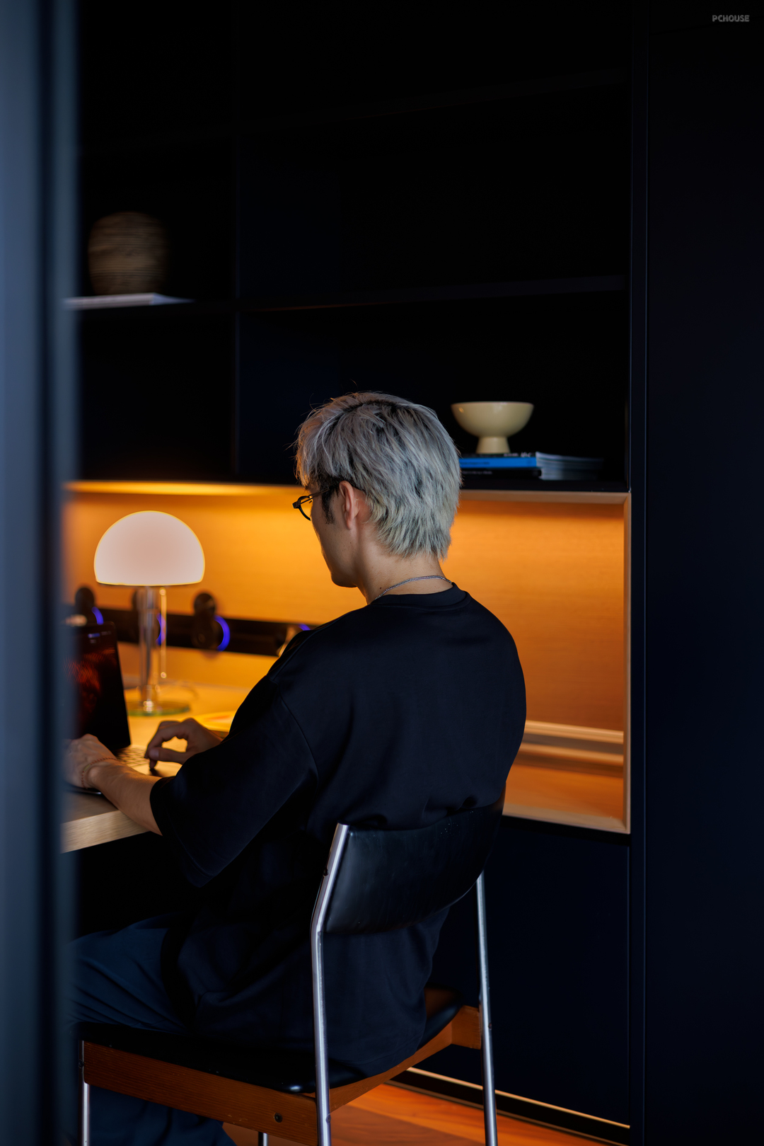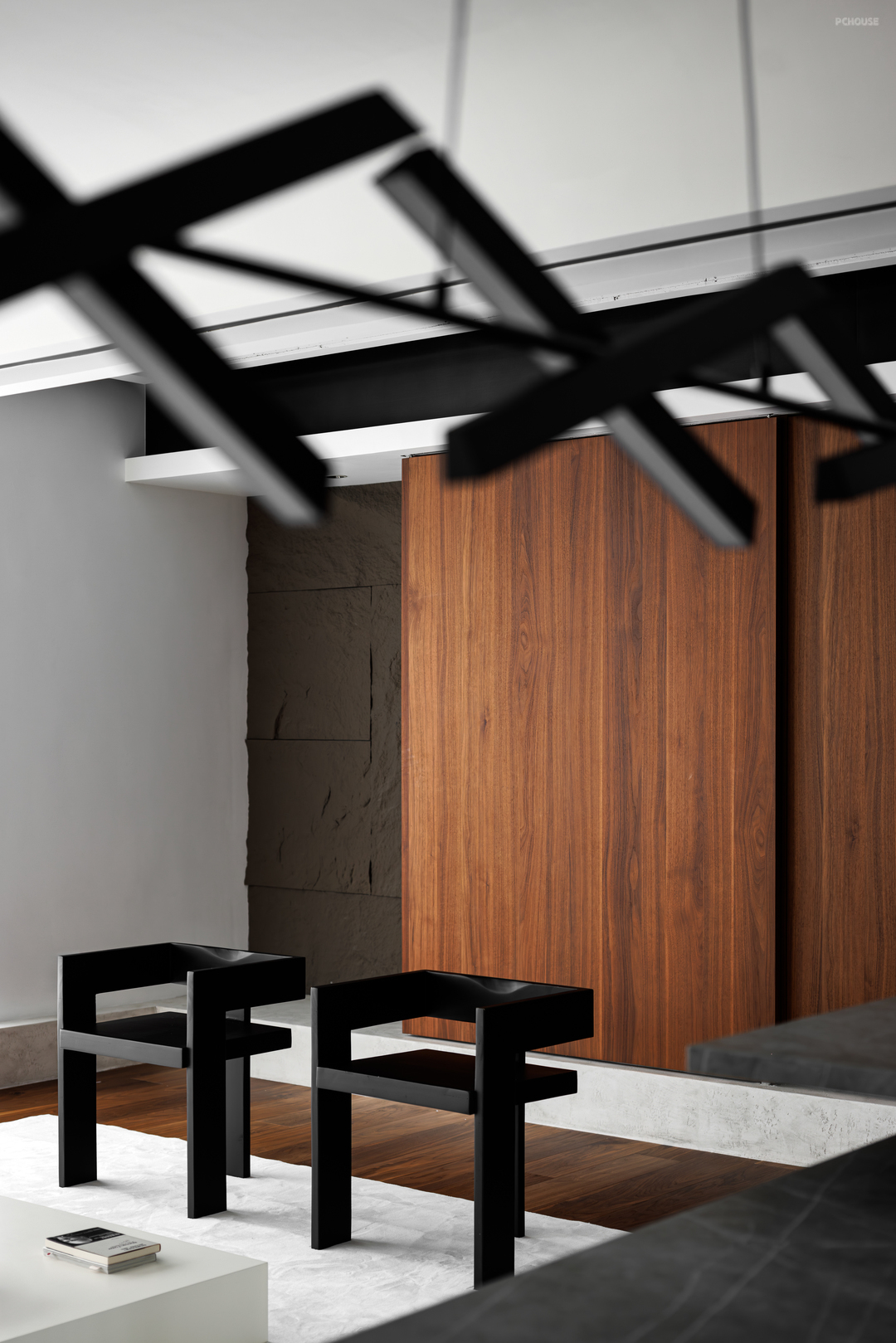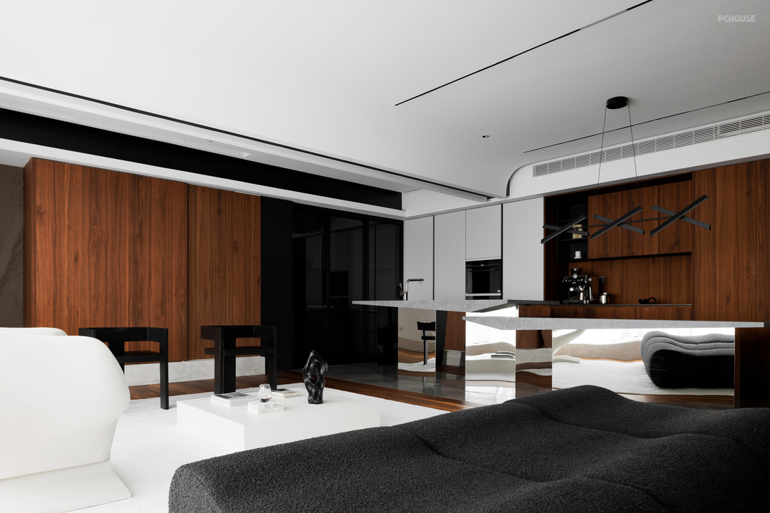 而深邃的胡桃木全屋又将这个锐不可当的气场拉回到一个安稳的境界,让人觉得所有想象可以放开天际又妥当落地。