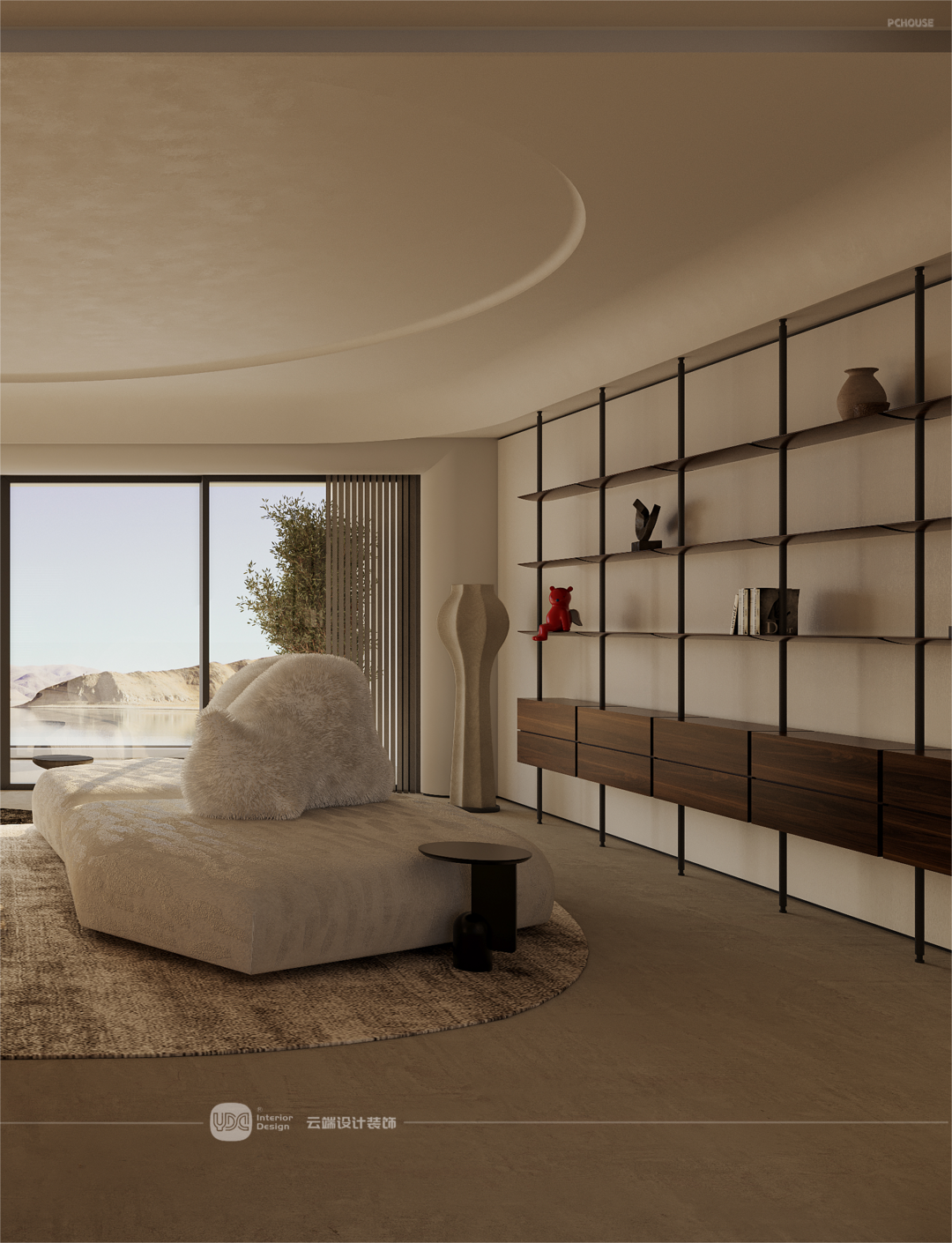 硬装部分借重主要由矿物质与石灰泥组合而成的特殊涂料,幻化为饶富诗意的垂直曲面,透过四片大面落地窗捕捉漫进的暖煦日光,在形式上表现出光影透润后的简。