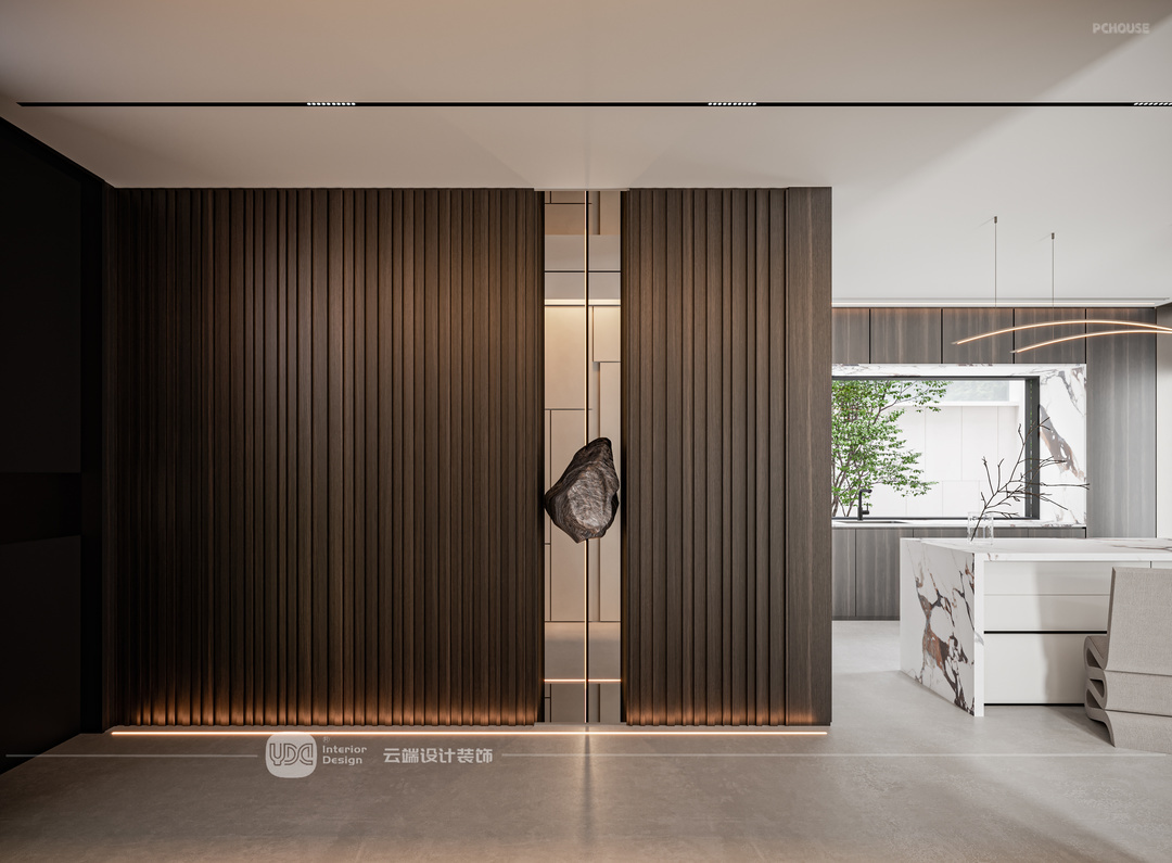 并且将背景的奢石进行热弯处理,让雕塑感的空间增添一丝柔美。回归原始质感的石、木、点缀不锈钢饰品,不做过多的修饰,让人回归自然感受大自然真正的美好。