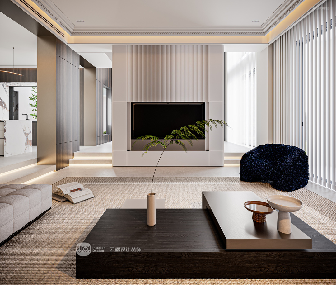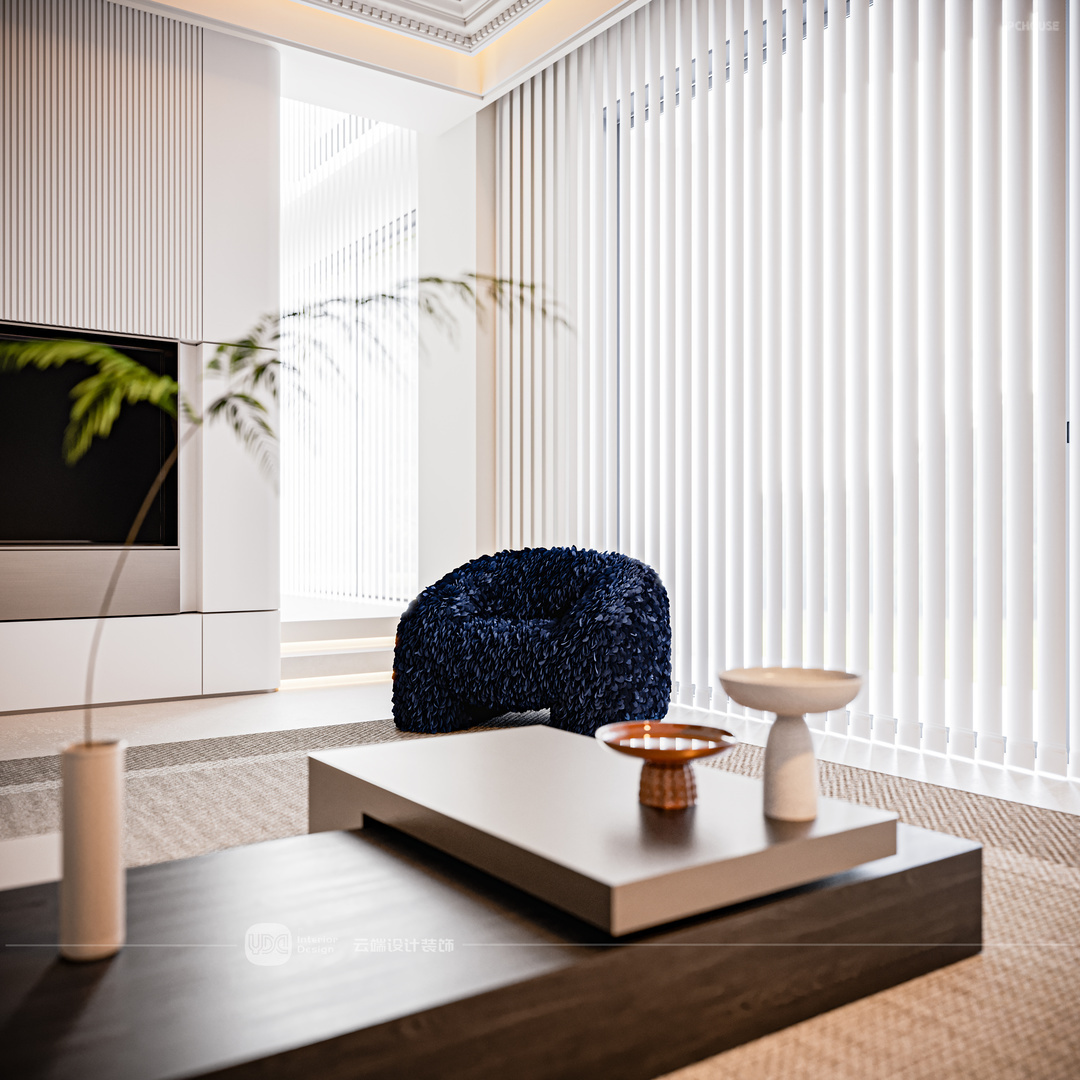 客厅中心的圆润金属雾面桌几,在光线映照下与地毯交织异材质的圈圈涟漪,增添雅兴;天花板线条设计,和白色窗帘的几何排列相应,柔和光影流泻,犹如音乐粒子洒落一地,让一室闲静获得共鸣。