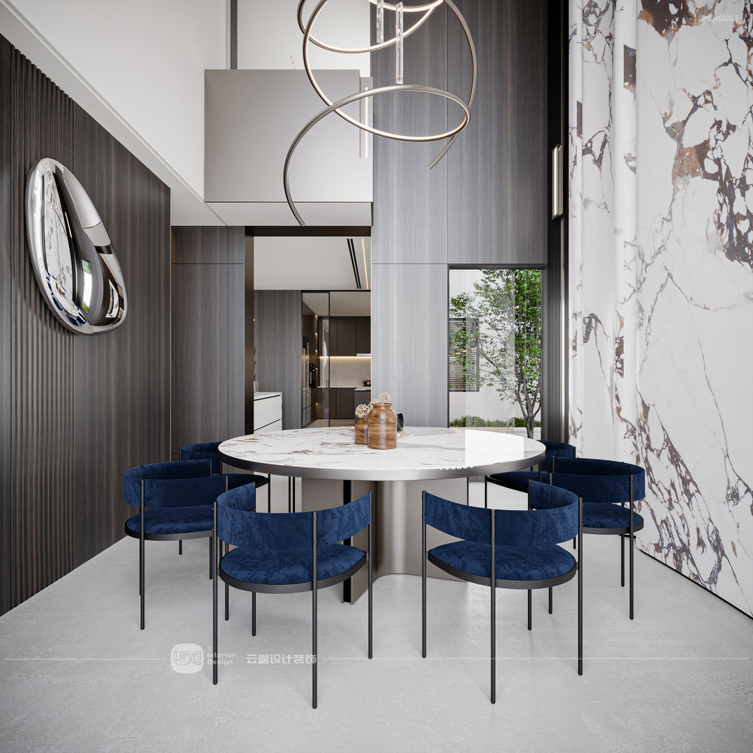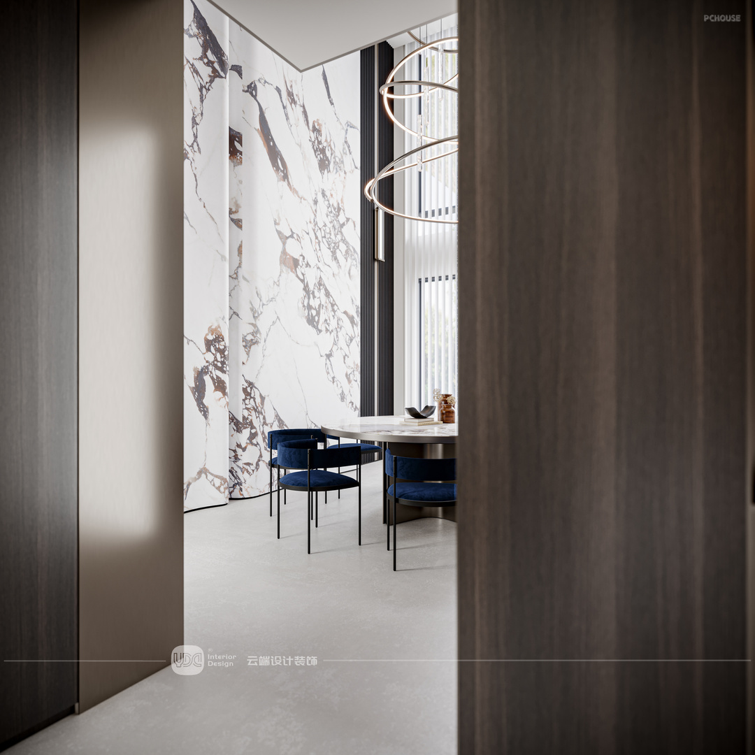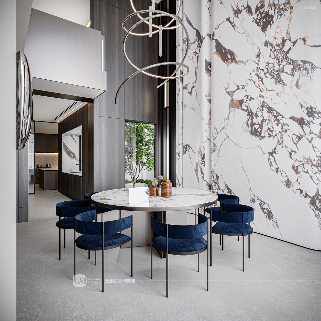 餐厅保留了近7米的挑高空间,背景选用了自然纹路的宝格丽奢石,最大尺度还原材质本身带来的视觉和感官特性,保留材质的原始质感。