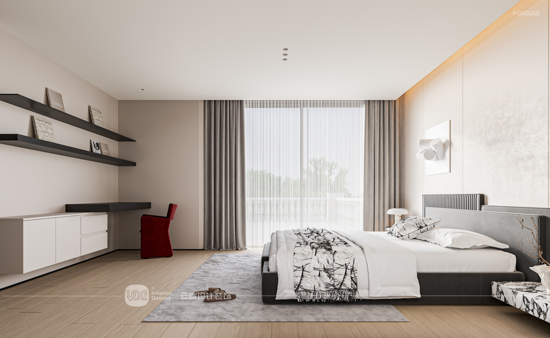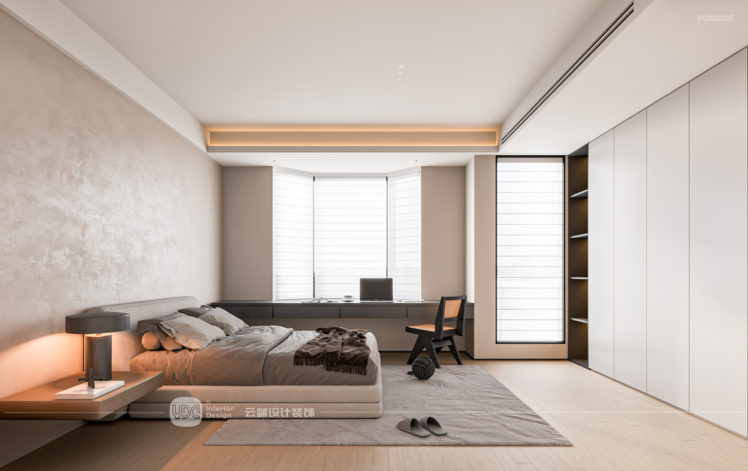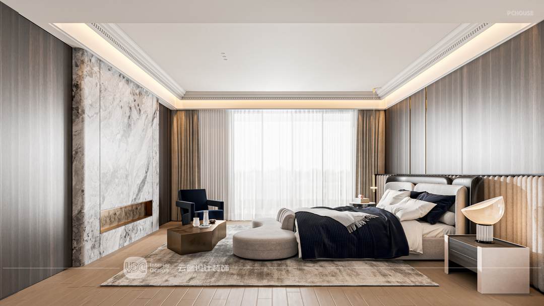 主卧专属定制床头屏风运用灰黑色木作+手工皮革材质靠背,床尾沙发定制浅棕真皮坐垫,饰有手工纹缝合针脚,简约精致,整体空间流淌着皮草的高贵气息。