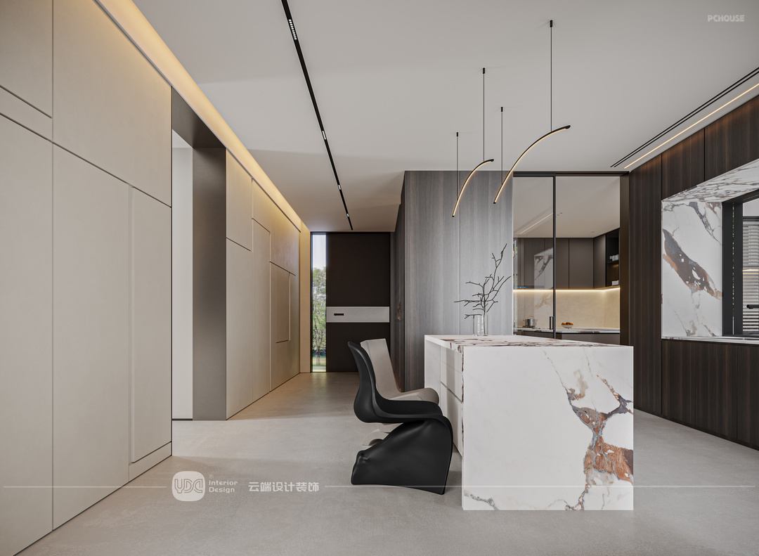 餐桌选用了天然纹理的陶瓷板质感,和桌腿的精美金属完美衔接,整体形态雕塑感十足。空间的高级感不是来自昂贵的材质而是恰到好处。